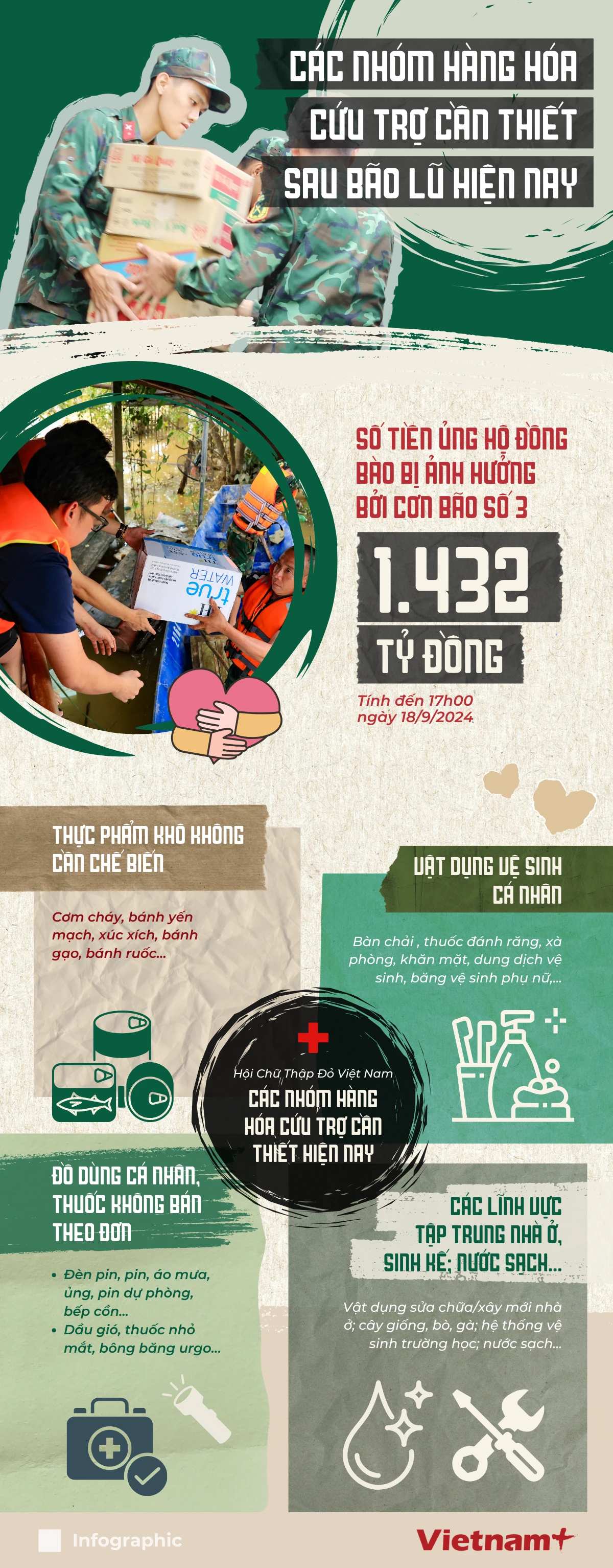 Trong giai đoạn phục hồi sau thiên tai, bão lũ, Hội Chữ thập đỏ Việt Nam đã cập nhật các nhóm hàng hóa cứu trợ cần thiết để đáp ứng nhu cầu người dân.