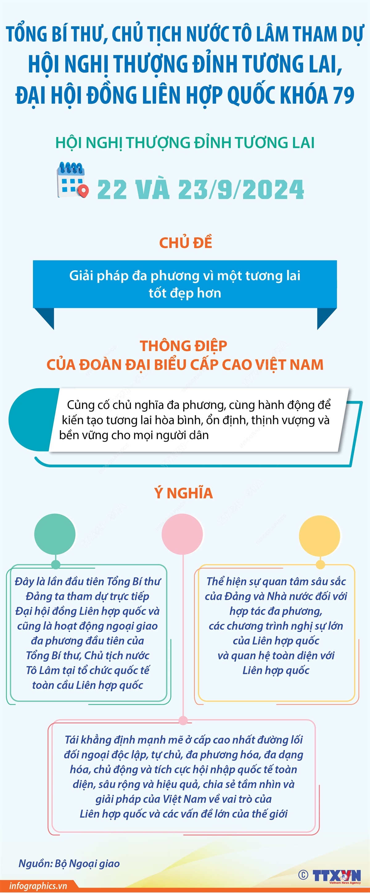 Từ ngày 21/9/2024, Tổng Bí thư, Chủ tịch nước Tô Lâm và phu nhân cùng đoàn đại biểu cấp cao Việt Nam tham dự Hội nghị thượng đỉnh Tương lai, Đại hội đồng Liên hợp quốc Khóa 79. Việc Tổng Bí thư, Chủ tịch nước Tô Lâm tham dự sự kiện này có một ý nghĩa hết sức quan trọng