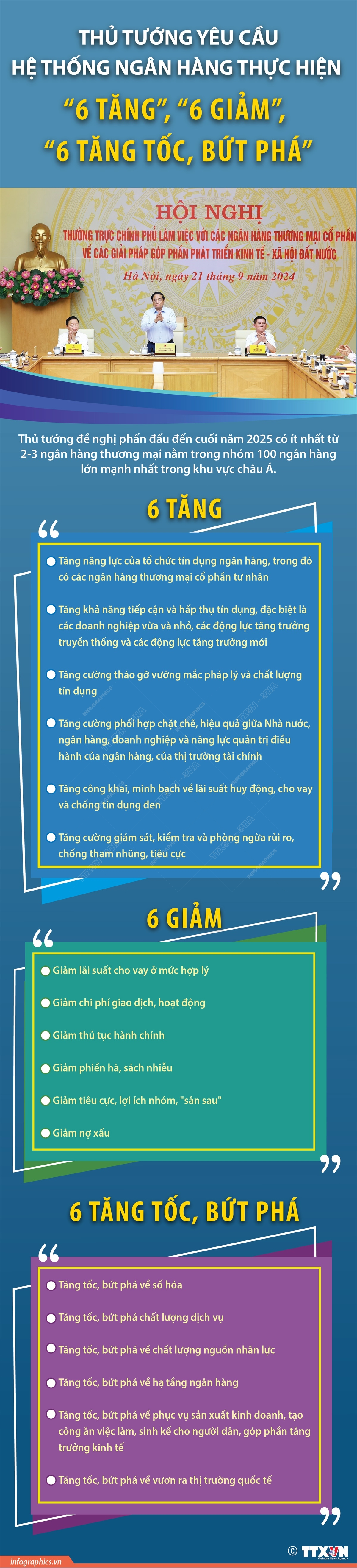 Chiều 21/9/2024, kết luận Hội nghị Thường trực Chính phủ với các ngân hàng thương mại cổ phần về các giải pháp góp phần phát triển kinh tế - xã hội đất nước, Thủ tướng Chính phủ Phạm Minh Chính yêu cầu hệ thống ngân hàng thực hiện "6 tăng, 6 giảm, 6 tăng tốc, bứt phá" để cùng đất nước phát triển, phấn đấu đến cuối năm 2025 có ít nhất từ 2-3 ngân hàng thương mại nằm trong nhóm 100 ngân hàng lớn mạnh nhất trong khu vực châu Á.