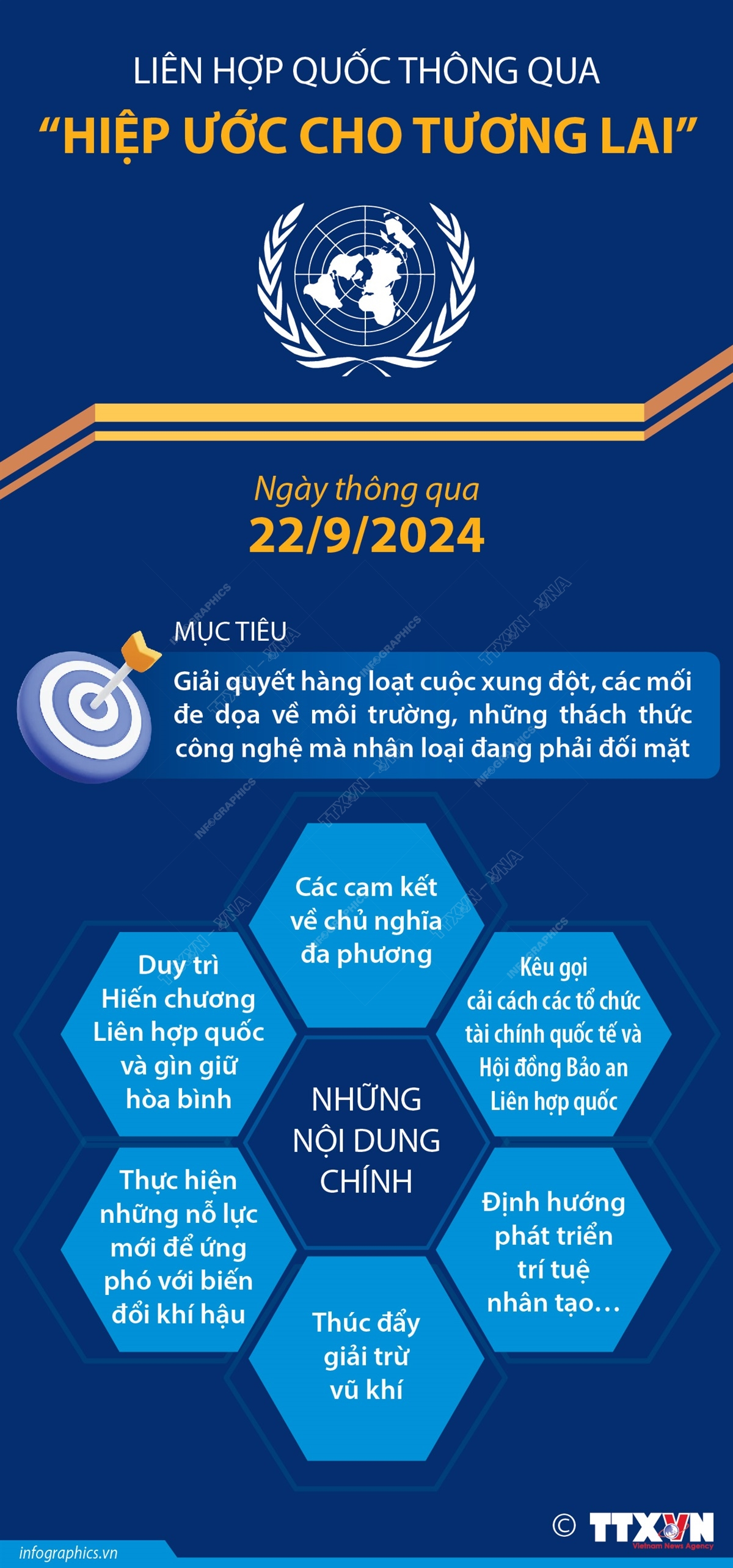 Với đa số ý kiến tán thành, ngày 22/9/2024, các thành viên Liên hợp quốc (LHQ) đã thông qua “Hiệp ước cho tương lai” nhằm giải quyết hàng loạt cuộc xung đột, các mối đe dọa về môi trường, cũng như những thách thức công nghệ mà nhân loại đang phải đối mặt. Tổ chức đa phương này đánh giá đây là bản kế hoạch tương lai “mang tính đột phá”.