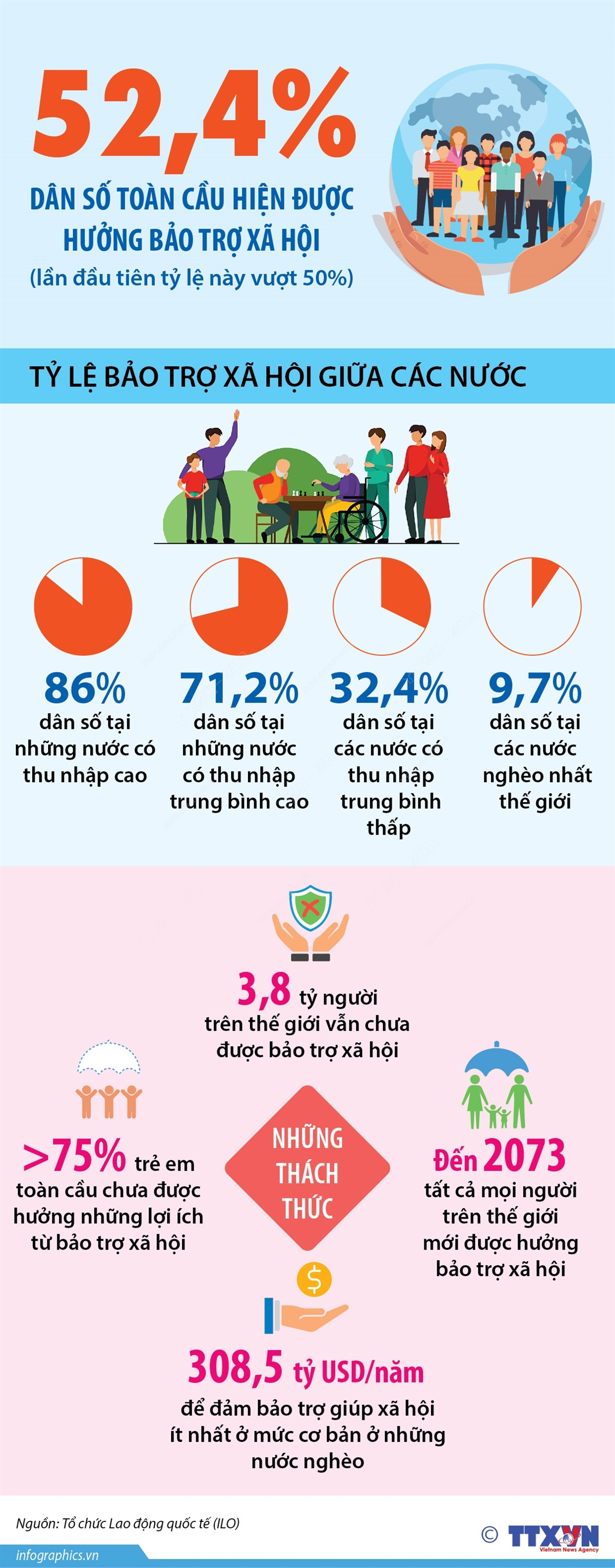 Tổ chức Lao động quốc tế (ILO) giữa tháng 9/2024 công bố báo cáo cho thấy lần đầu tiên hơn 50% dân số toàn cầu được hưởng bảo trợ xã hội. ILO đánh giá dù đây là tiến bố đáng hoan nghênh, nhưng thực tế 3,8 tỷ người vẫn chưa được bảo trợ, nhấn mạnh hơn 75% trẻ em trên thế giới vẫn chưa được hưởng những lợi ích này.
