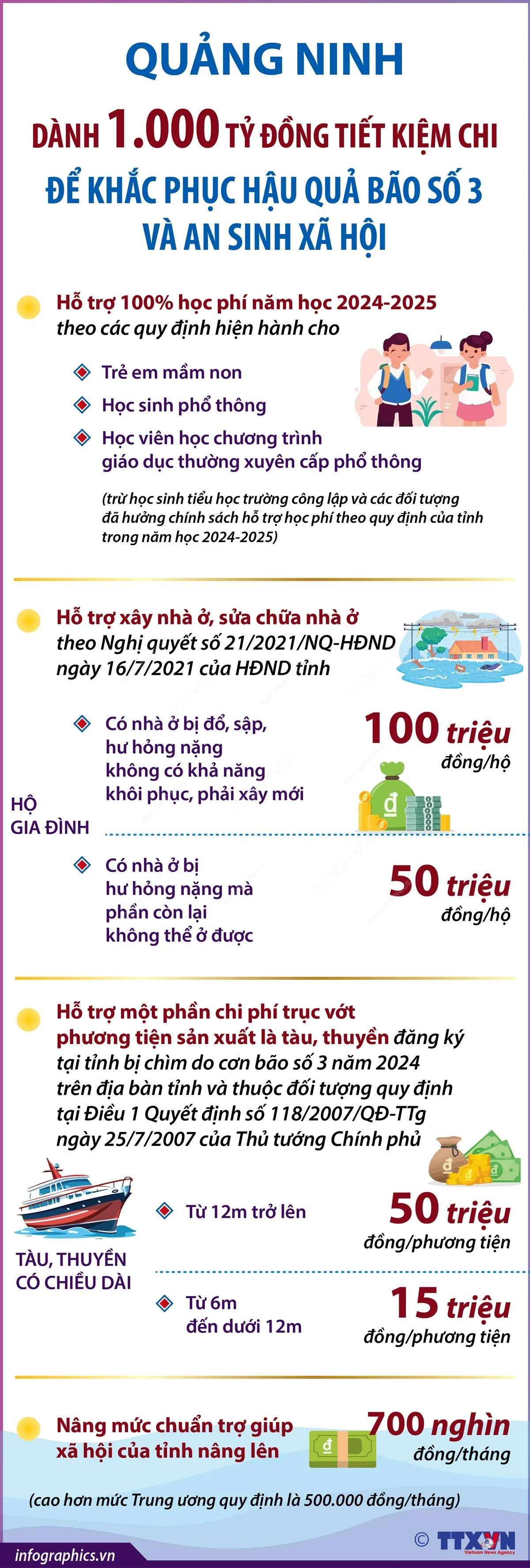Tỉnh Quảng Ninh đã quyết định bố trí 1.000 tỷ đồng để khắc phục hậu quả bão số 3 gây ra và thực hiện các chính sách an sinh xã hội như hỗ trợ học phí cho học sinh, xây dựng mới nhà ở....