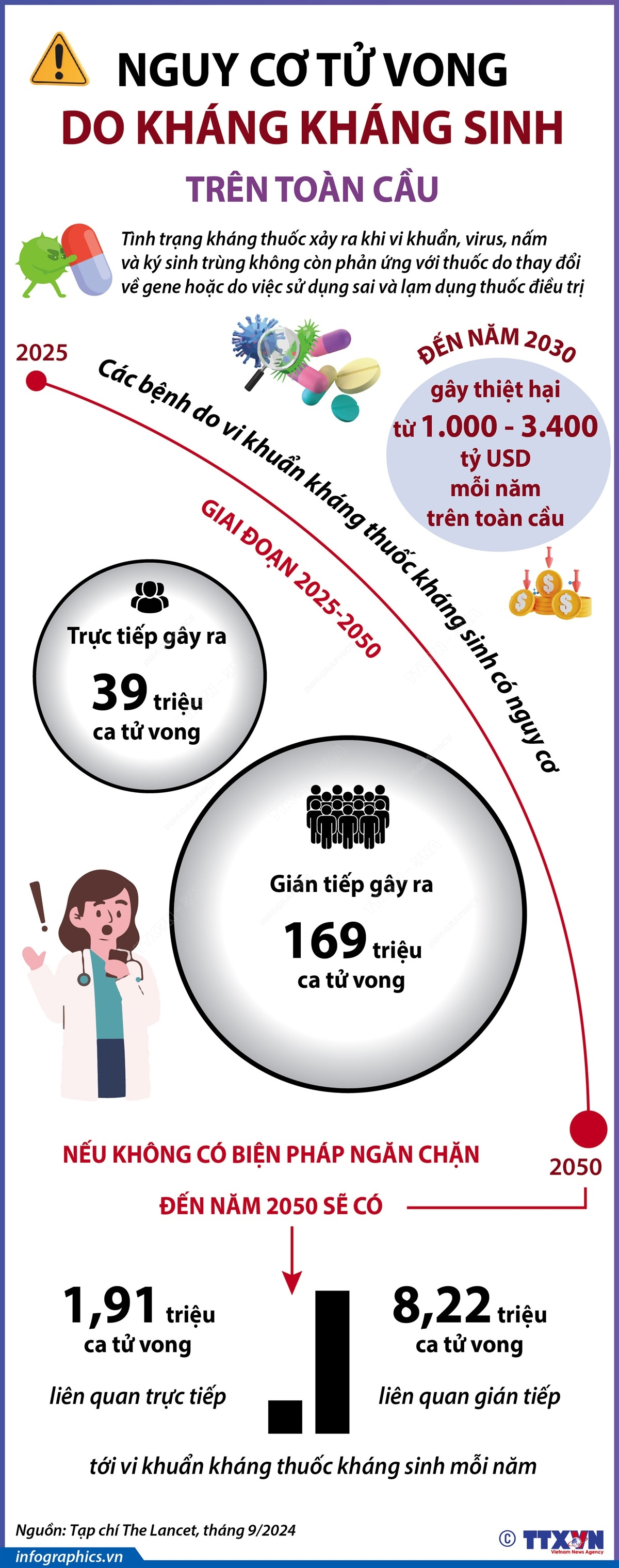 Các bệnh do vi khuẩn kháng thuốc kháng sinh có nguy cơ trực tiếp gây ra 39 triệu ca tử vong, cũng như gián tiếp gây ra 169 triệu ca tử vong trên toàn thế giới trong giai đoạn 2025 - 2050. Đây là dự báo của nhóm nhà khoa học quốc tế thuộc Dự án nghiên cứu toàn cầu về kháng thuốc kháng sinh. Nghiên cứu được đăng trên tạp chí The Lancet giữa tháng 9/2024.