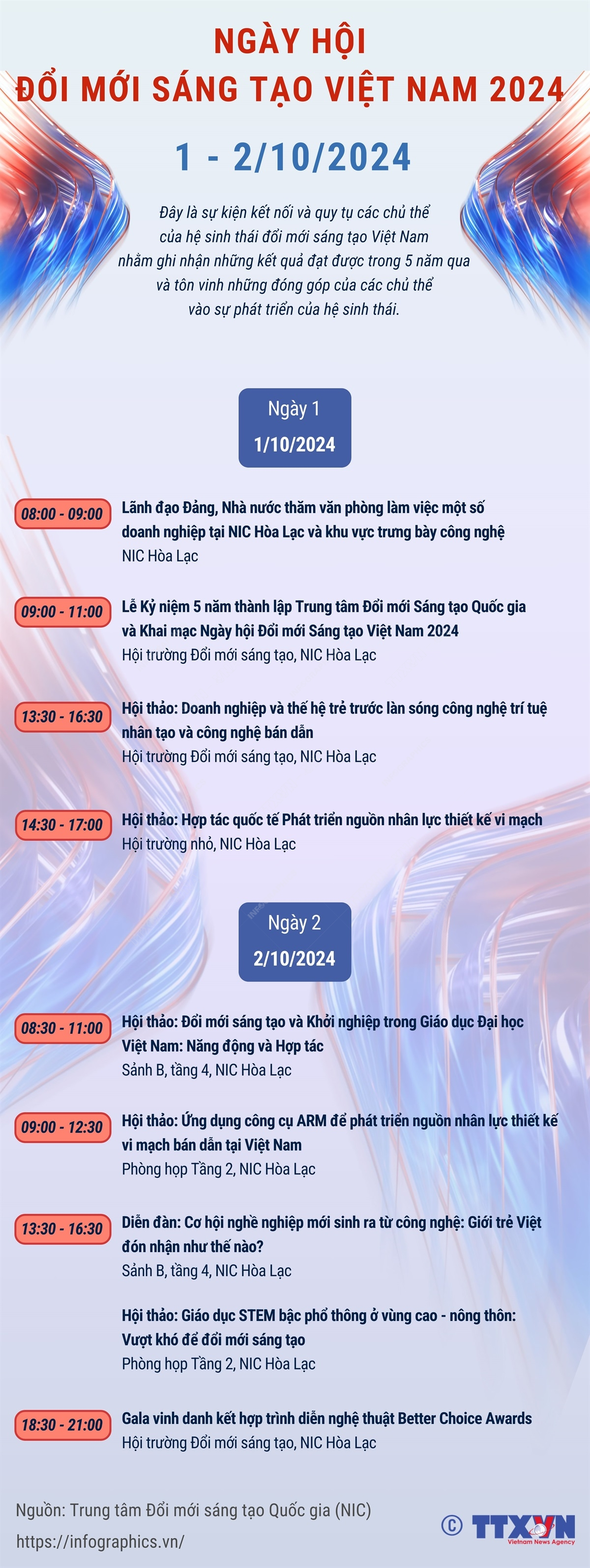 Trong hai ngày 1 và 2/10/2014, Lễ kỷ niệm 5 năm thành lập Trung tâm Đổi mới sáng tạo quốc gia (NIC) và Ngày hội Đổi mới sáng tạo Việt Nam 2024 được tổ chức tại Khu công nghệ cao Hòa Lạc. Đây là sự kiện kết nối và quy tụ các chủ thể của hệ sinh thái đổi mới sáng tạo Việt Nam nhằm ghi nhận những kết quả đạt được trong 5 năm qua và tôn vinh những đóng góp của các chủ thể vào sự phát triển của hệ sinh thái, trong đó NIC đóng vai trò là đầu mối dẫn dắt.