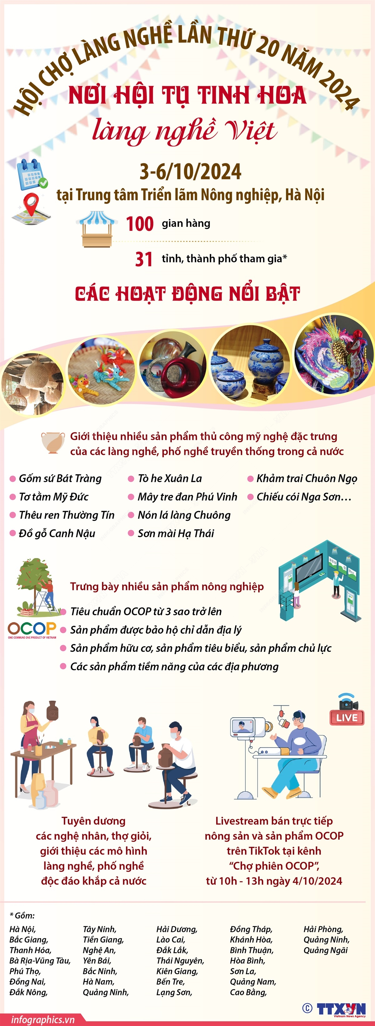 Hội chợ Làng nghề Việt Nam lần thứ 20 năm 2024 diễn ra từ ngày 3-6/10/2024 tại Trung tâm Triển lãm Nông nghiệp, Hà Nội. Hội chợ có quy mô 100 gian hàng tiêu chuẩn và trên 1.000m2 diện tích đất trưng bày được thiết kế, trang trí đặc biệt. Hội chợ làng nghề năm nay diễn ra với nhiều hoạt động nổi bật và ý nghĩa.