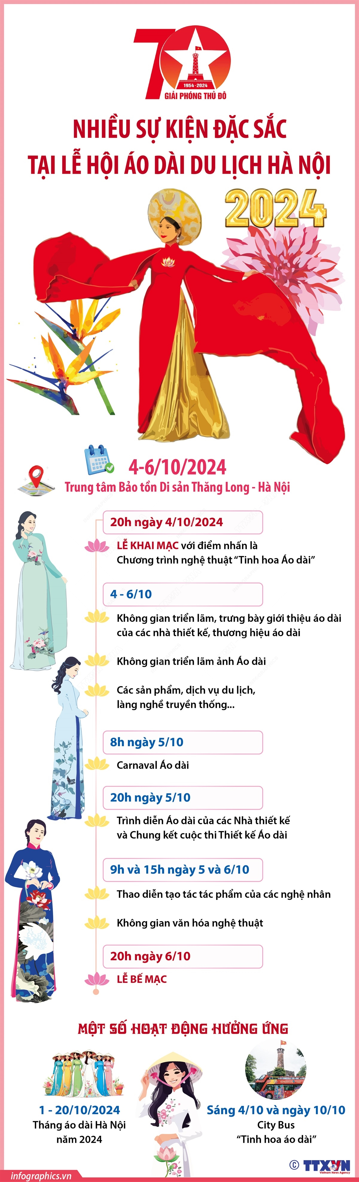 Lễ hội Áo dài du lịch Hà Nội 2024 tại Trung tâm Bảo tồn Di sản Thăng Long - Hà Nội. Lễ hội là hoạt động có ý nghĩa tốt đẹp nhằm tôn vinh và khai thác tà áo dài dân tộc như một sản phẩm du lịch độc đáo, thiết thực kỷ niệm 70 năm Ngày Giải phóng Thủ đô (10/10/1954 - 10/10/2024).