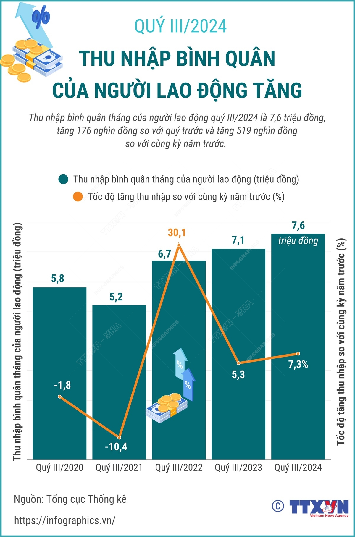 Thu nhập bình quân tháng của người lao động quý III/2024 là 7,6 triệu đồng, tăng 176 nghìn đồng so với quý trước và tăng 519 nghìn đồng so với cùng kỳ năm trước.