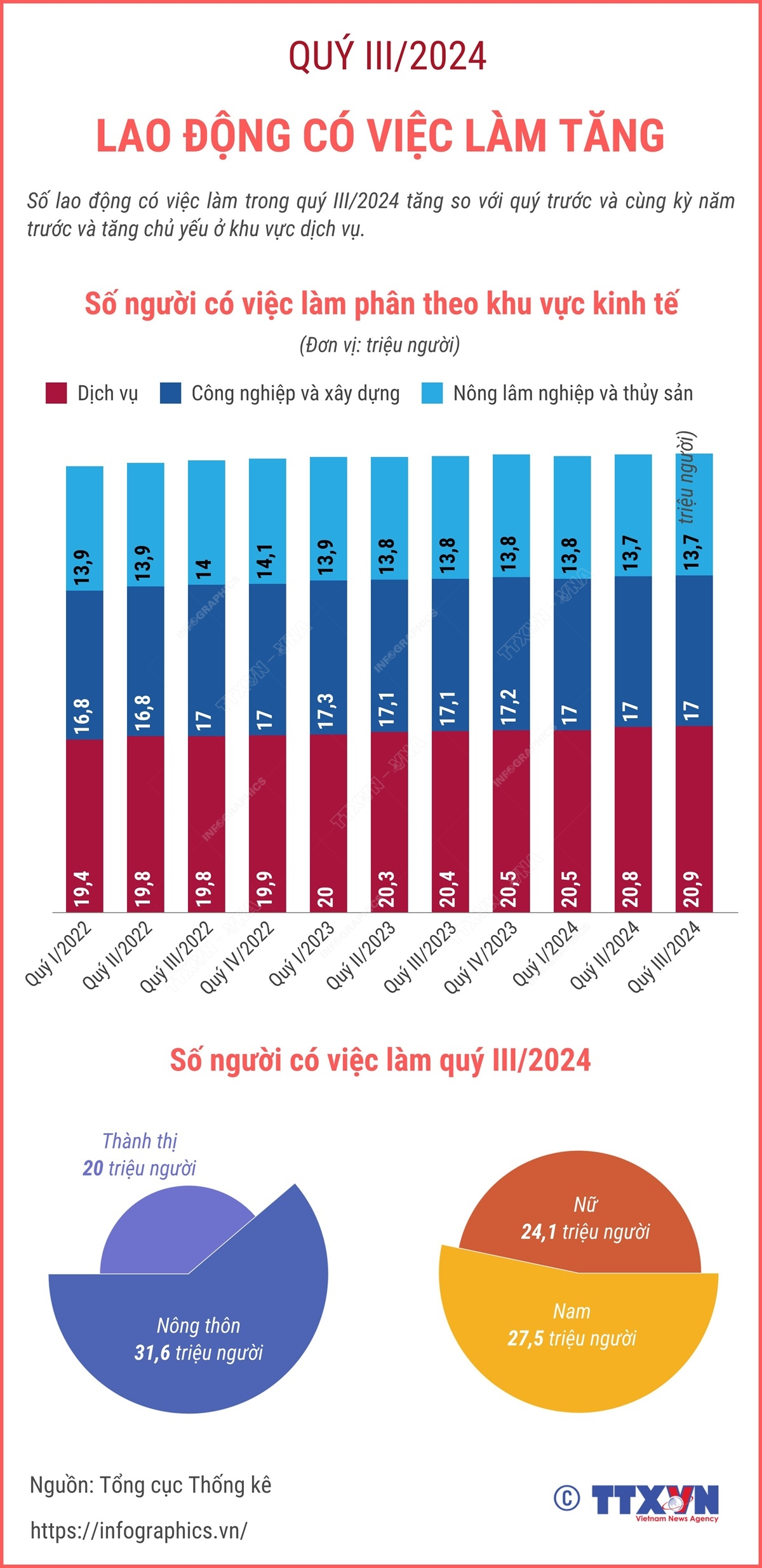 Số lao động có việc làm trong quý III/2024 tăng so với quý trước và cùng kỳ năm trước và tăng chủ yếu ở khu vực dịch vụ.