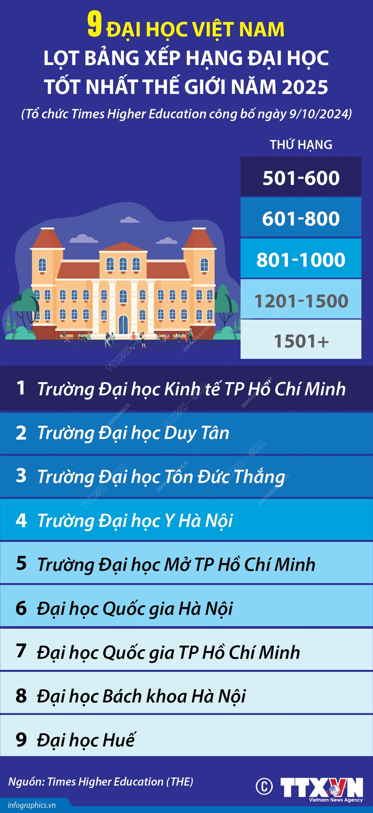 Tổ chức Times Higher Education (THE) ngày 9/10/2024 công bố bảng xếp hạng đại học tốt nhất thế giới năm 2025. Trong 9 đại học của Việt Nam vừa lọt vào bảng xếp hạng đại học thế giới năm 2025 của THE, lần đầu tiên có tên Trường Đại học Y Hà Nội.