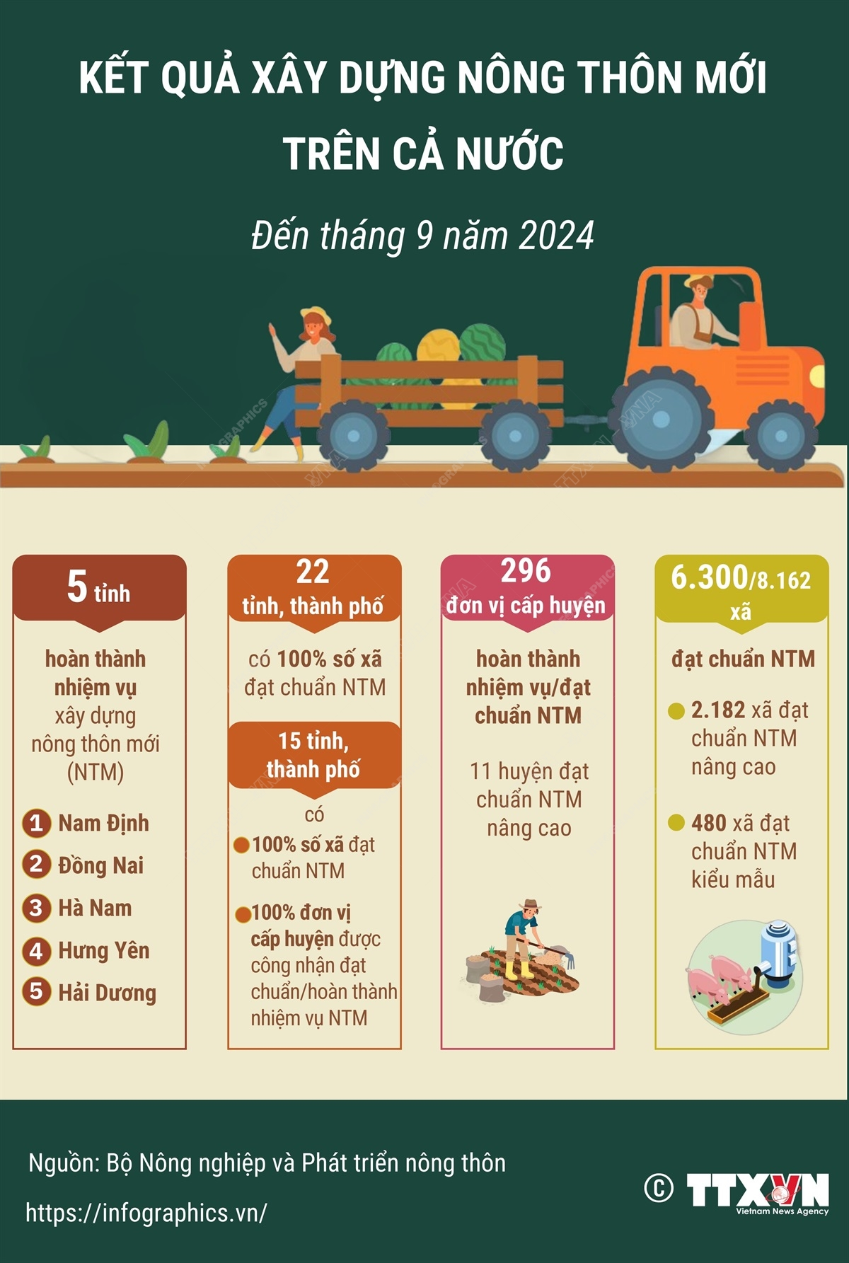 Theo báo cáo của Bộ Nông nghiệp và Phát triển nông thôn, ước thực hiện các mục tiêu, nhiệm vụ của Chương trình mục tiêu quốc gia xây dựng nông thôn mới đến tháng 9 năm 2024 như sau: có 5 tỉnh (Nam Định, Đồng Nai, Hà Nam, Hưng Yên và Hải Dương) hoàn thành nhiệm vụ xây dựng nông thôn mới; 22 tỉnh, thành phố có 100% số xã đạt chuẩn nông thôn mới; 296 đơn vị cấp huyện thuộc 58 tỉnh, thành phố hoàn thành nhiệm vụ/đạt chuẩn nông thôn mới; 6.300/8.162 xã trên cả nước đạt chuẩn nông thôn mới.