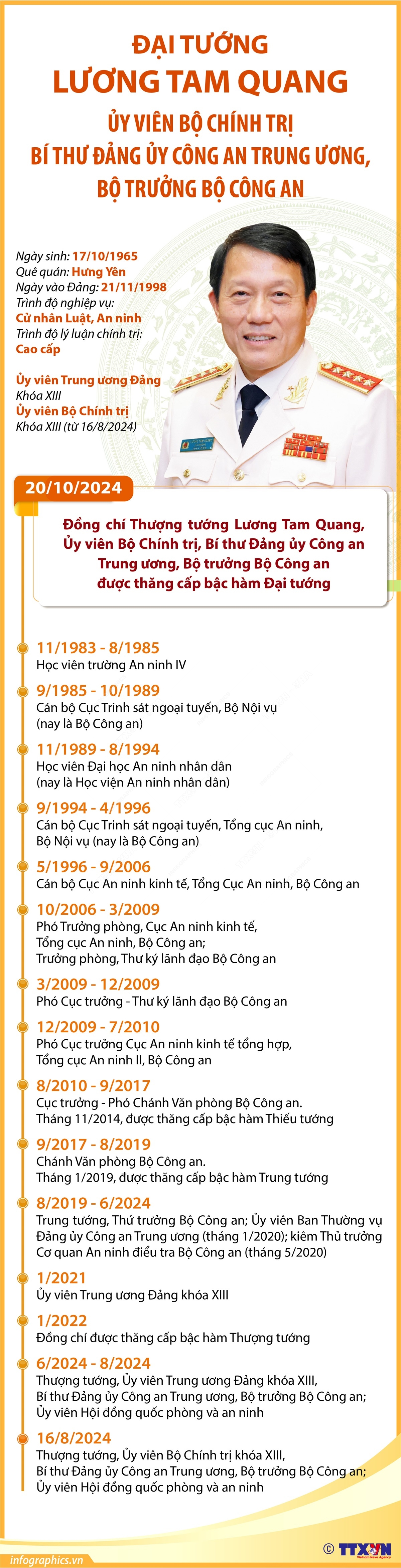 Ngày 20/10/2024, tại Phủ Chủ tịch, Tổng Bí thư, Chủ tịch nước Tô Lâm, Bí thư Quân ủy Trung ương, Chủ tịch Hội đồng Quốc phòng và An ninh, Thống lĩnh các lực lượng vũ trang đã trao Quyết định thăng cấp bậc hàm Đại tướng đối với Thượng tướng Lương Tam Quang, Ủy viên Bộ Chính trị, Bí thư Đảng ủy Công an Trung ương, Bộ trưởng Bộ Công an.