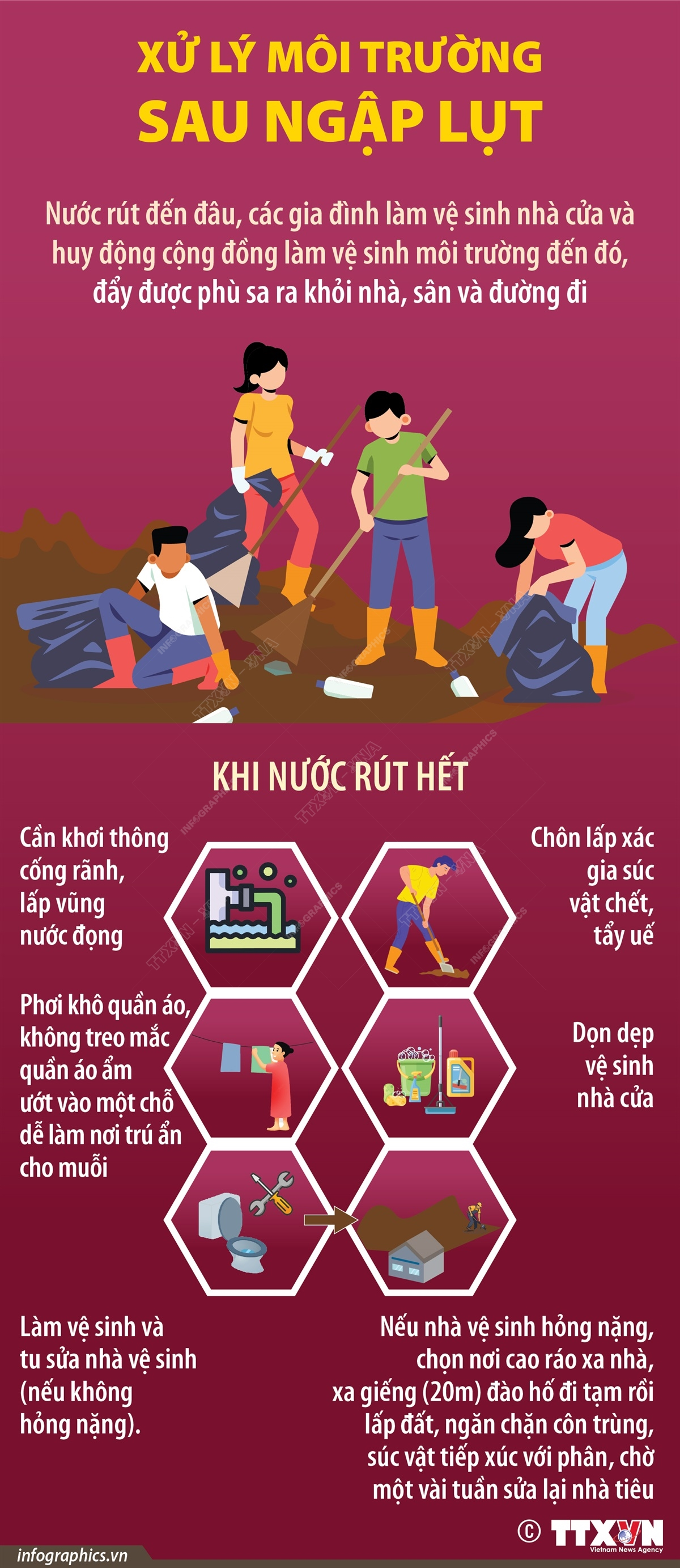 Để xử lý môi trường sau ngập lụt, các chuyên gia khuyến cáo nước rút đến đâu, các gia đình làm vệ sinh nhà cửa và huy động cộng đồng làm vệ sinh môi trường đến đó, đẩy được phù sa ra khỏi nhà, sân và đường đi.
