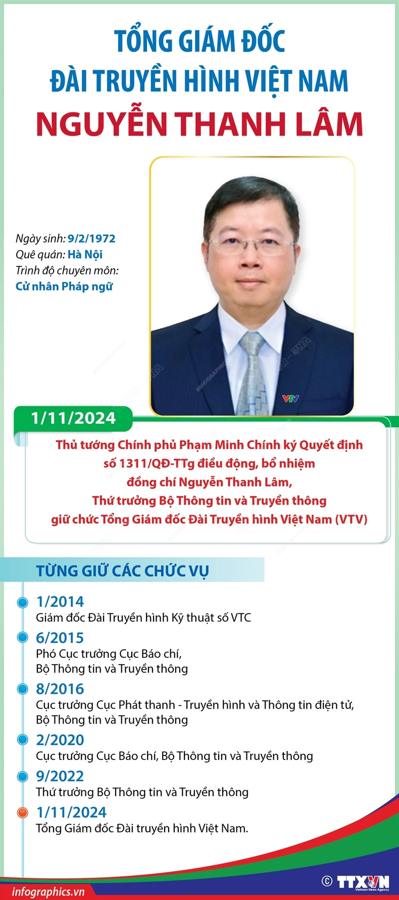 Thủ tướng Phạm Minh Chính ký Quyết định điều động, bổ nhiệm đồng chí Nguyễn Thanh Lâm, Thứ trưởng Thông tin và Truyền thông giữ chức Tổng Giám đốc Đài Truyền hình Việt Nam (VTV). Thời hạn bổ nhiệm là 5 năm. Quyết định có hiệu lực từ ngày 1/11/2024.