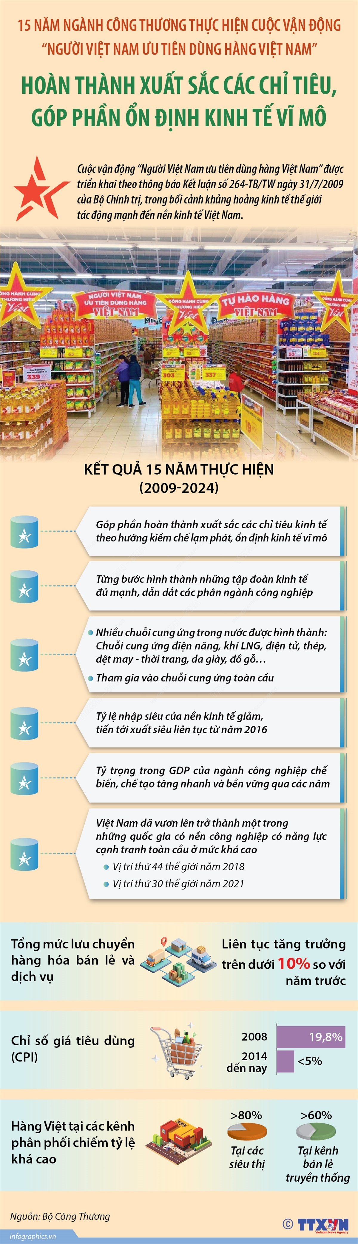 Bộ Công Thương ngày 12/11/2024 tổ chức Gala 15 năm ngành Công Thương thực hiện Cuộc vận động “Người Việt Nam ưu tiên dùng hàng Việt Nam”. Được triển khai từ năm 2009 theo thông báo Kết luận số 264-TB/TW ngày 31/7/2009 của Bộ Chính trị, Cuộc vận động “Người Việt Nam ưu tiên dùng hàng Việt Nam” (Cuộc vận động) đã góp phần hoàn thành xuất sắc các chỉ tiêu kinh tế theo hướng kiềm chế lạm phát, ổn định kinh tế vĩ mô.