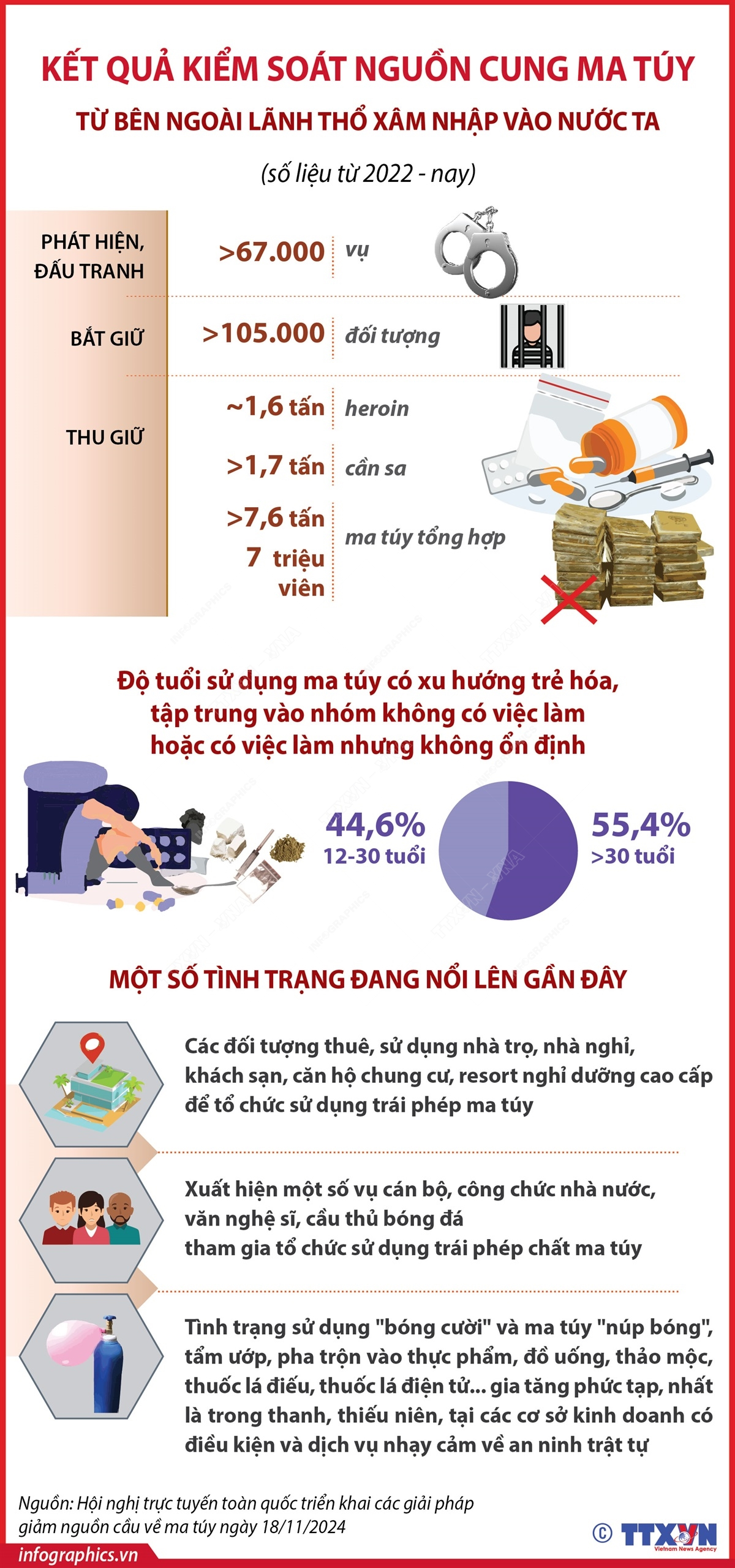 Theo Bộ Công an, từ năm 2022 đến nay, lực lượng Công an nhân dân đã chủ trì, phối hợp với lực lượng chức năng phát hiện, đấu tranh hơn 67.000 vụ, bắt giữ hơn 105.000 đối tượng; thu giữ gần 1,6 tấn heroin, hơn 1,7 tấn cần sa, hơn 7,6 tấn và 7 triệu viên ma túy tổng hợp. Những kết quả trên cho thấy việc đấu tranh chặn nguồn cung ma túy đã được lực lượng chức năng làm tốt, kiểm soát được nguồn cung ma túy từ bên ngoài lãnh thổ xâm nhập vào nước ta, không để Việt Nam trở thành địa bàn trung chuyển ma túy quốc tế.