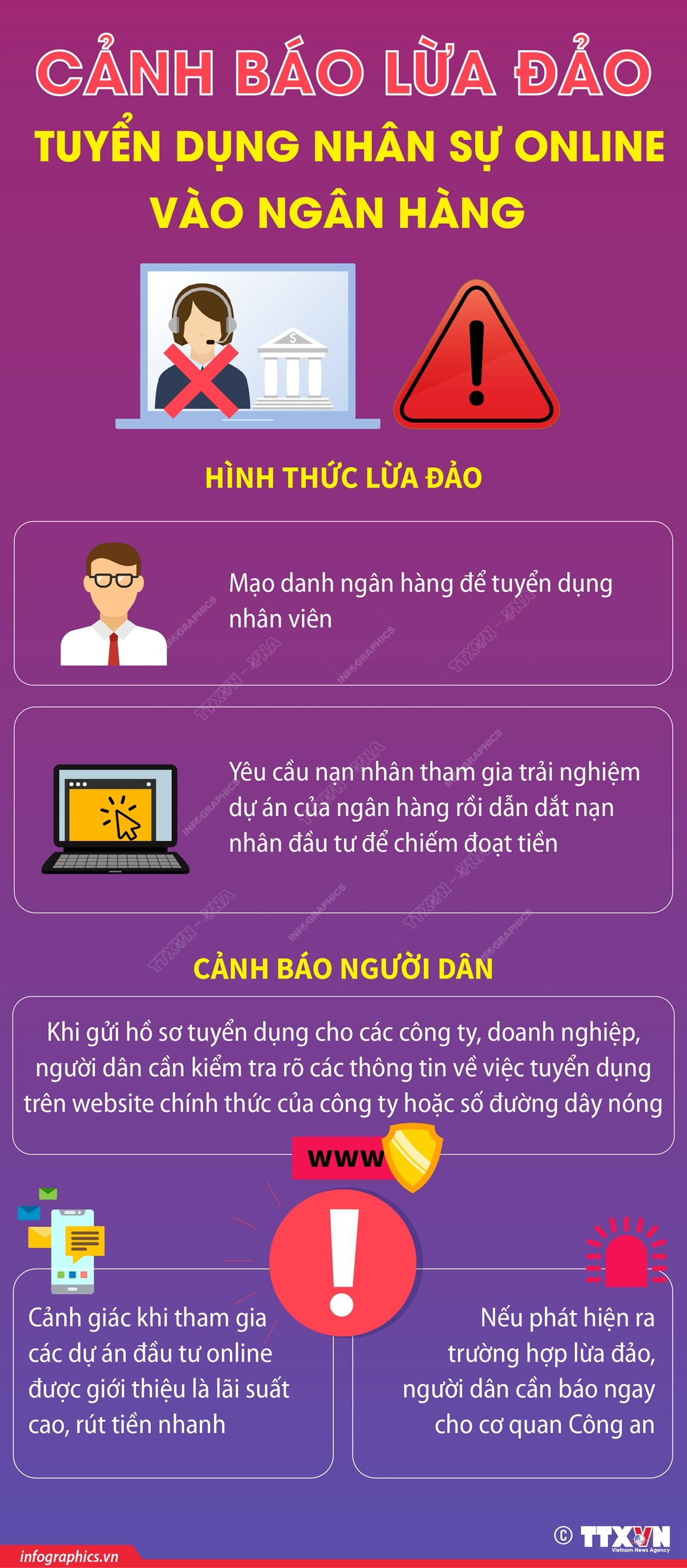 Thời gian qua, xuất hiện thủ đoạn lừa đảo qua hình thức mạo danh ngân hàng để tuyển dụng nhân viên. Các đối tượng sẽ yêu cầu nạn nhân tham gia trải nghiệm dự án của ngân hàng rồi dẫn dắt nạn nhân đầu tư để chiếm đoạt tiền.