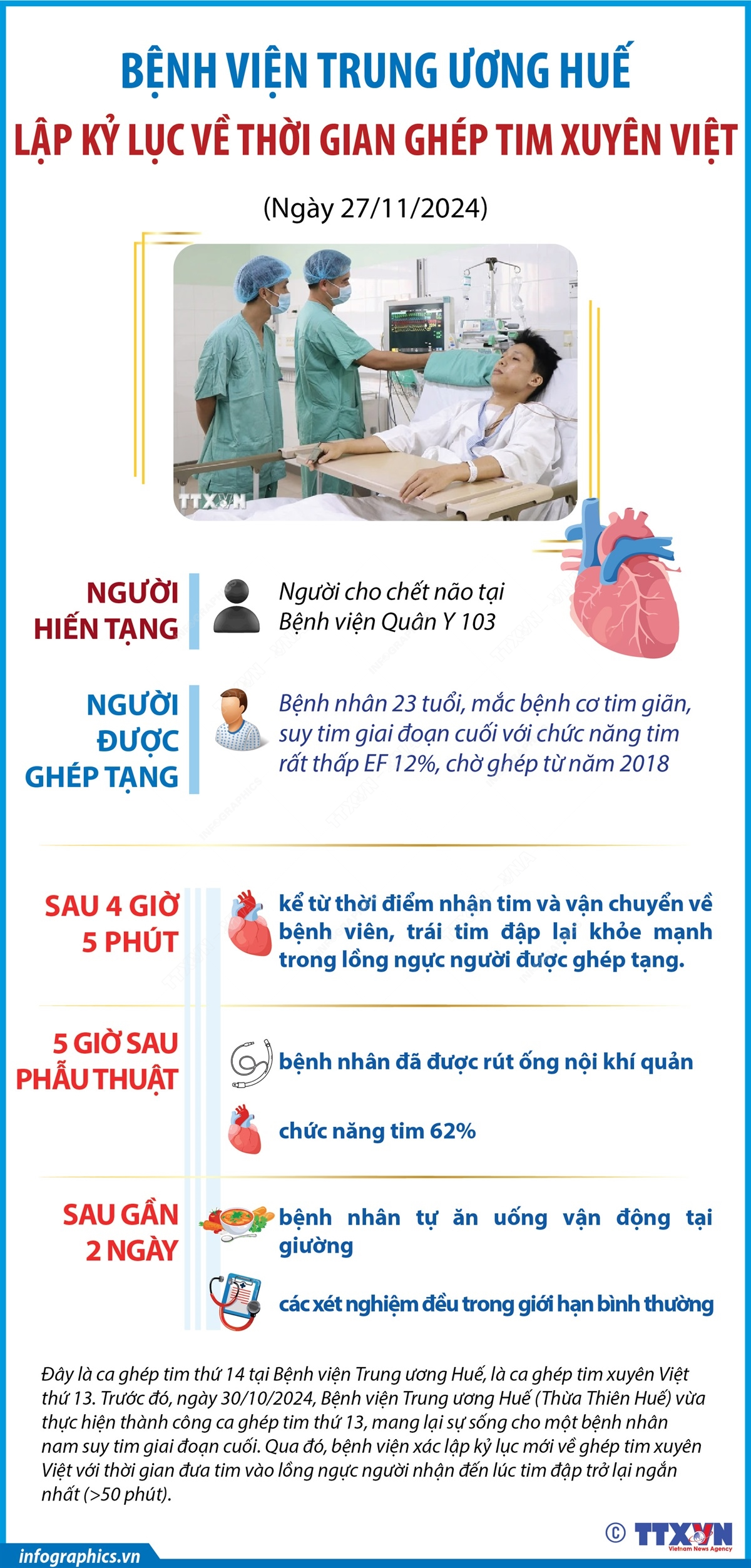 Bệnh viện Trung ương Huế thông tin, đơn vị vừa thực hiện thành ca ghép tim thứ 14 mang lại sự sống cho một bệnh nhân bị mắc bệnh cơ tim giãn, suy tim giai đoạn cuối. Thành công này giúp bệnh viện lập kỷ lục về thời gian ghép tim xuyên Việt chỉ 4 giờ 5 phút tính từ thời điểm nhận tim, vận chuyển và tim đập lại khỏe mạnh trong lồng ngực người bệnh. Sau gần 2 ngày được ghép tim, bệnh nhân tự ăn uống vận động tại giường, các xét nghiệm đều trong giới hạn bình thường.