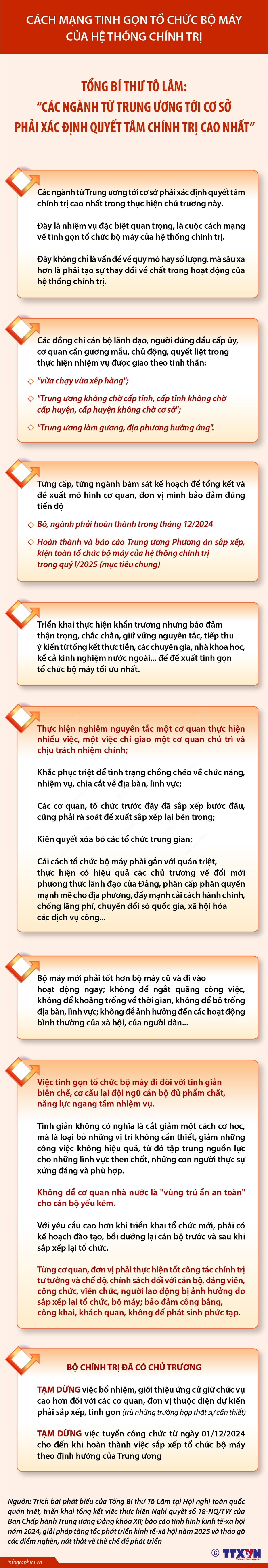 Phát biểu tại Hội nghị toàn quốc quán triệt, triển khai tổng kết việc thực hiện Nghị quyết số 18 và một số nội dung quan trọng, Tổng Bí thư Tô Lâm đề nghị: Các ngành từ Trung ương tới cơ sở phải xác định quyết tâm chính trị cao nhất trong thực hiện chủ trương này. Đây là nhiệm vụ đặc biệt quan trọng, là cuộc cách mạng về tinh gọn tổ chức bộ máy của hệ thống chính trị. Đây không chỉ là vấn đề về quy mô hay số lượng, mà sâu xa hơn là phải tạo sự thay đổi về chất trong hoạt động của hệ thống chính trị. Các đồng chí cán bộ lãnh đạo, người đứng đầu cấp ủy, cơ quan cần gương mẫu, chủ động, quyết liệt trong thực hiện nhiệm vụ được giao theo tinh thần "vừa chạy vừa xếp hàng"; "Trung ương không chờ cấp tỉnh, cấp tỉnh không chờ cấp huyện, cấp huyện không chờ cơ sở"; "Trung ương làm gương, địa phương hưởng ứng".