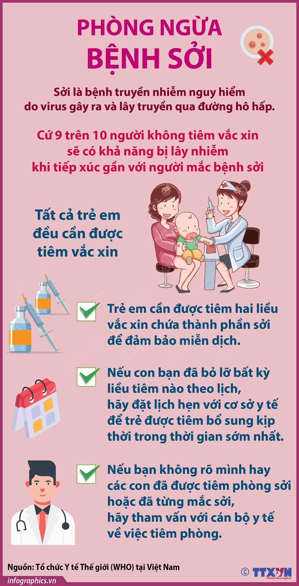 Trong bối cảnh dịch sởi đang có diễn biến phức tạp tại nhiều địa phương thì việc tiêm vắc xin phòng bệnh là vô cùng cần thiết. Sởi là bệnh truyền nhiễm nguy hiểm do virus gây ra và lây truyền qua đường hô hấp. Cứ 9 trên 10 người không tiêm vắc xin sẽ có khả năng bị lây nhiễm khi tiếp xúc gần với người mắc bệnh sởi. Tất cả trẻ em đều cần được tiêm vắc xin.