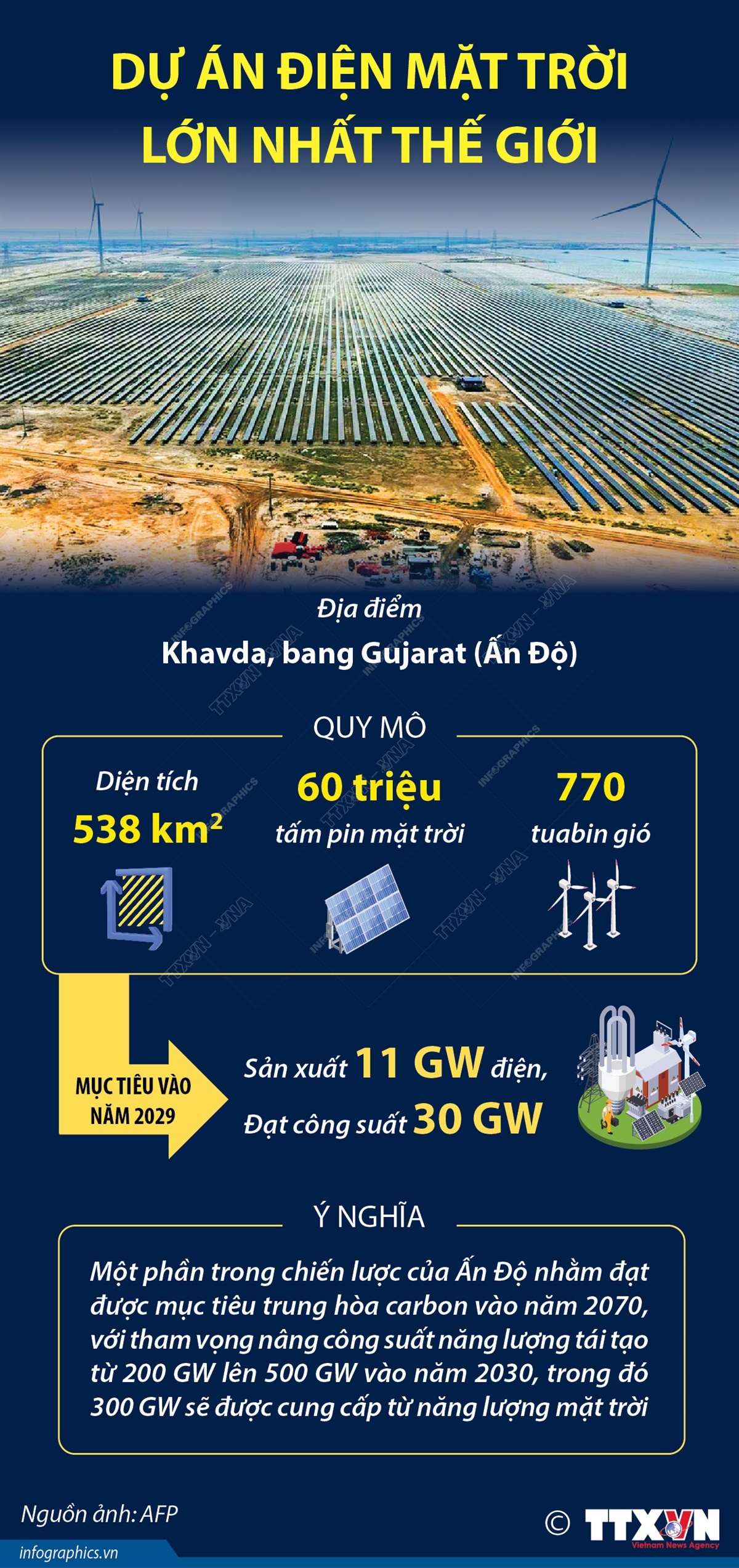 Dự án nhà máy năng lượng tái tạo lớn nhất thế giới này đang được xây dựng tại Khavda, bang Gujarat, Ấn Độ. Dự án được kỳ vọng sẽ tạo ra bước ngoặt lớn trong ngành năng lượng tái tạo của Ấn Độ, với 60 triệu tấm pin mặt trời và 770 tuabin gió, trải rộng trên diện tích lên tới 538 km2 - diện tích gần tương đương với thành phố Mumbai.