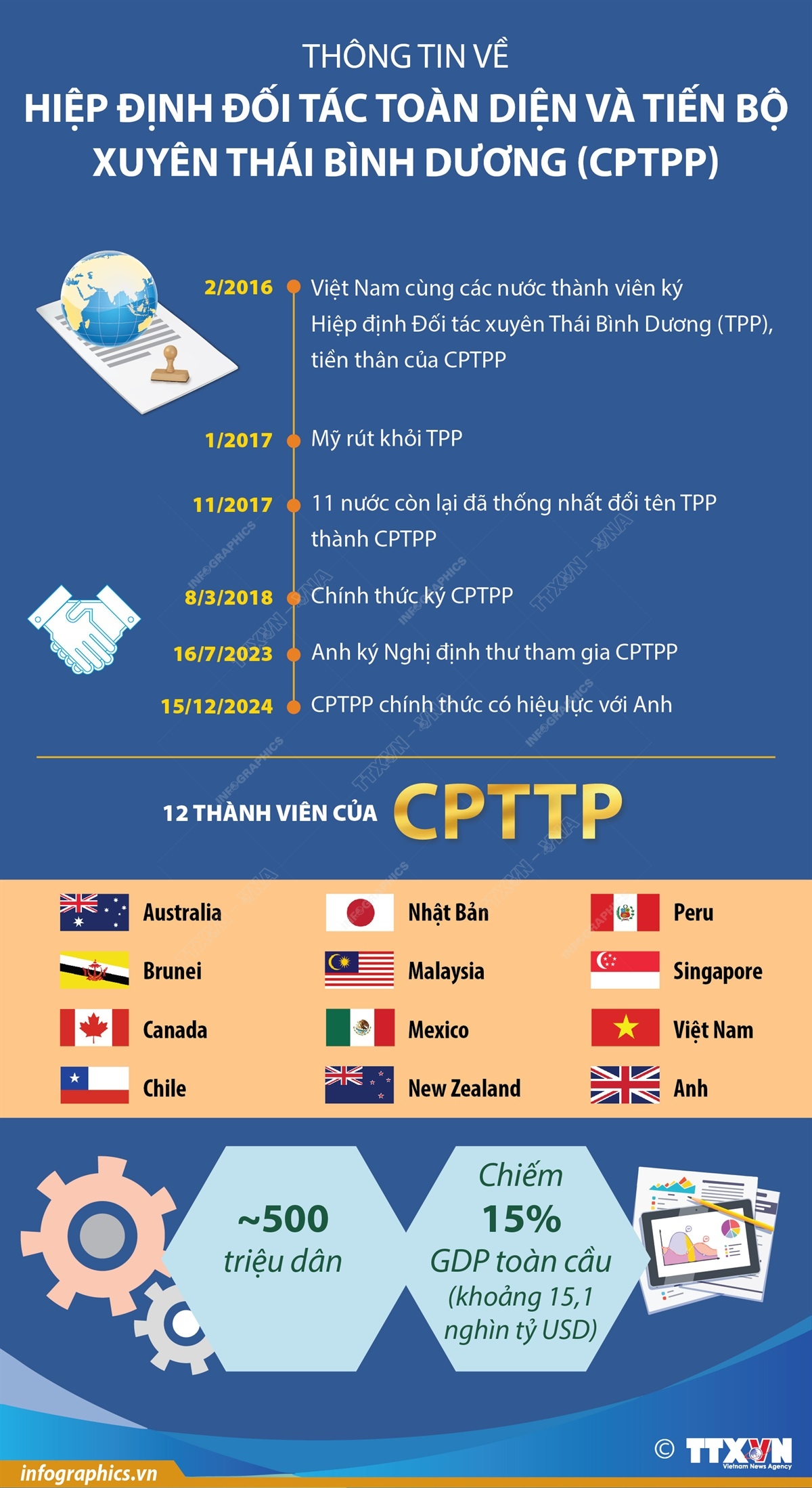 Ngày 15/12/2024, Anh đã trở thành quốc gia châu Âu đầu tiên gia nhập Hiệp định Đối tác Toàn diện và Tiến bộ xuyên Thái Bình Dương (CPTPP). Đây là thỏa thuận thương mại lớn nhất của nước này thời hậu Brexit (Anh rời khỏi Liên minh châu Âu). Với việc gia nhập CPTPP, Anh chính thức trở thành thành viên thứ 12 của khối thương mại này. Được thành lập vào năm 2018 và đóng góp khoảng 15% GDP toàn cầu, CPTPP hiện quy tụ 2 thành viên của Nhóm các nước công nghiệp phát triển (G7) là Canada và Nhật Bản, cùng với Anh, Australia, New Zealand, Mexico, Peru, Chile, Singapore, Brunei, Malaysia và Việt Nam.