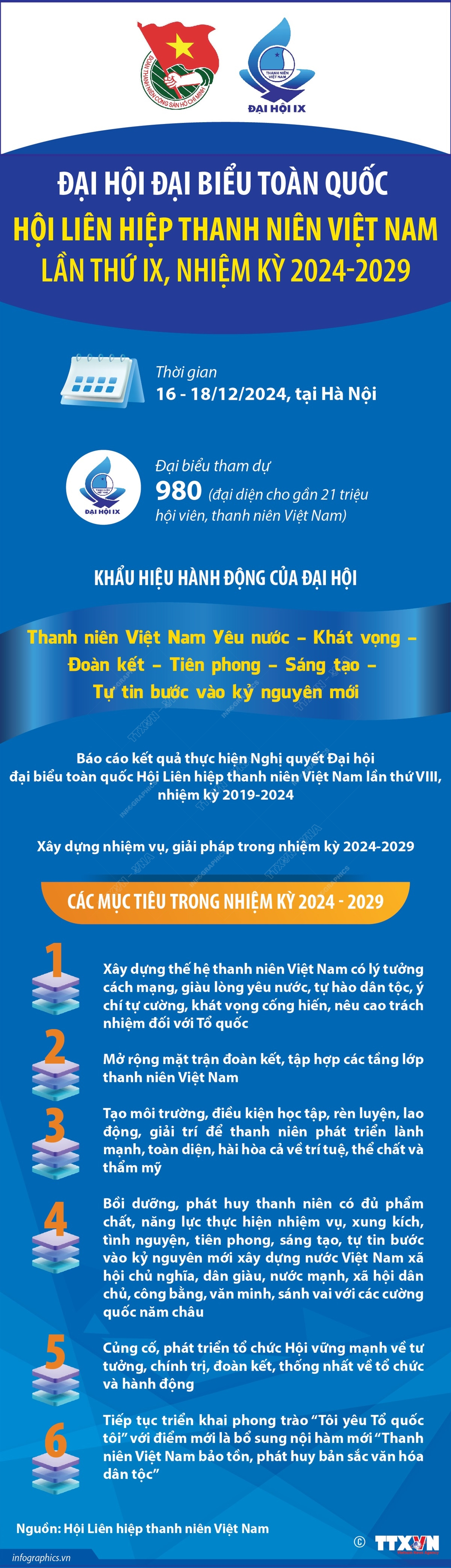 Từ ngày 16 - 18/12/2024, tại Hà Nội, Hội Liên hiệp thanh niên Việt Nam tổ chức Đại hội đại biểu toàn quốc Hội Liên hiệp thanh niên Việt Nam lần thứ IX, nhiệm kỳ 2024-2029. Đại hội có 980 đại biểu, đại diện cho hơn 21 triệu cán bộ, hội viên, thanh niên cả nước tham dự. Khẩu hiệu hành động trình tại Đại hội là “Thanh niên Việt Nam yêu nước - đoàn kết - khát vọng - sáng tạo - tiên phong - tự tin bước vào kỷ nguyên mới”. Đại hội là sự kiện quan trọng, ngày hội đoàn kết rộng rãi thanh niên Việt Nam yêu nước, đánh dấu bước phát triển mới của tổ chức Hội và phong trào thanh niên.