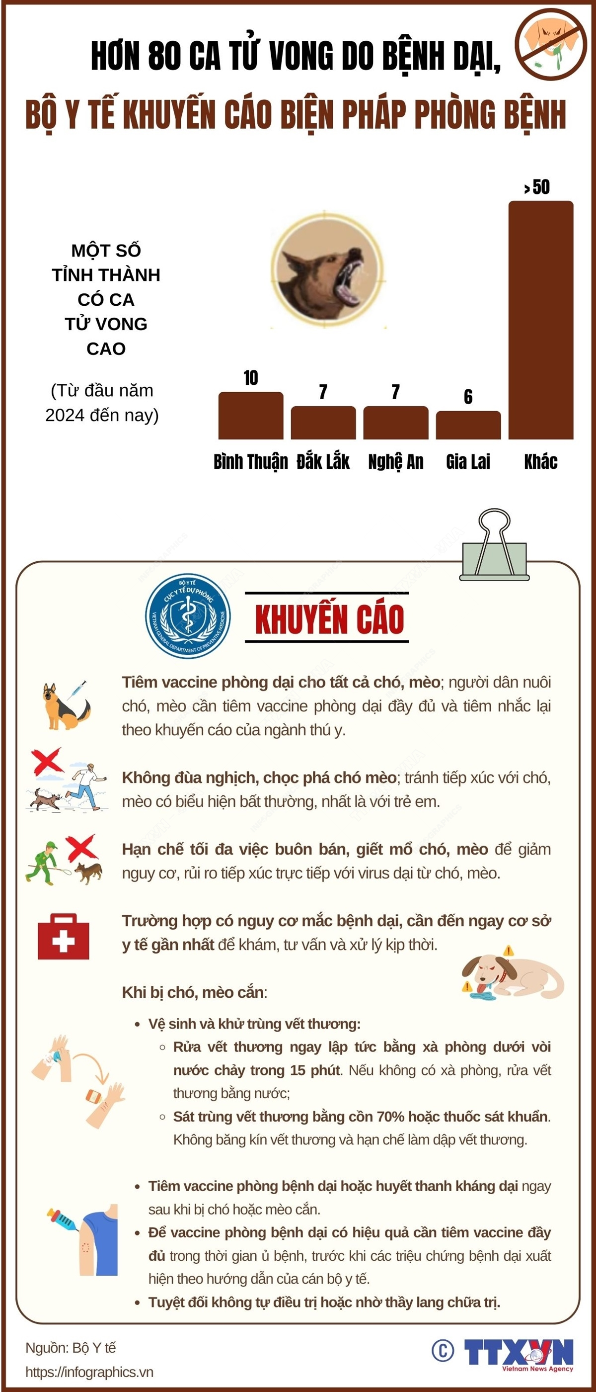 Từ đầu năm 2024 đến nay, cả nước ghi nhận hơn 80 trường hợp tử vong tại 33 tỉnh, thành phố, trong đó một số địa phương ghi nhận số tử vong ở người do bệnh dại cao là Bình Thuận (10 trường hợp), Đắk Lắk (7 trường hợp), Nghệ An (7 trường hợp), Gia Lai (6 trường hợp). Cục Y tế dự phòng cho biết, bệnh dại chưa có thuốc điều trị đặc hiệu, tuy nhiên hoàn toàn có thể phòng tránh được.