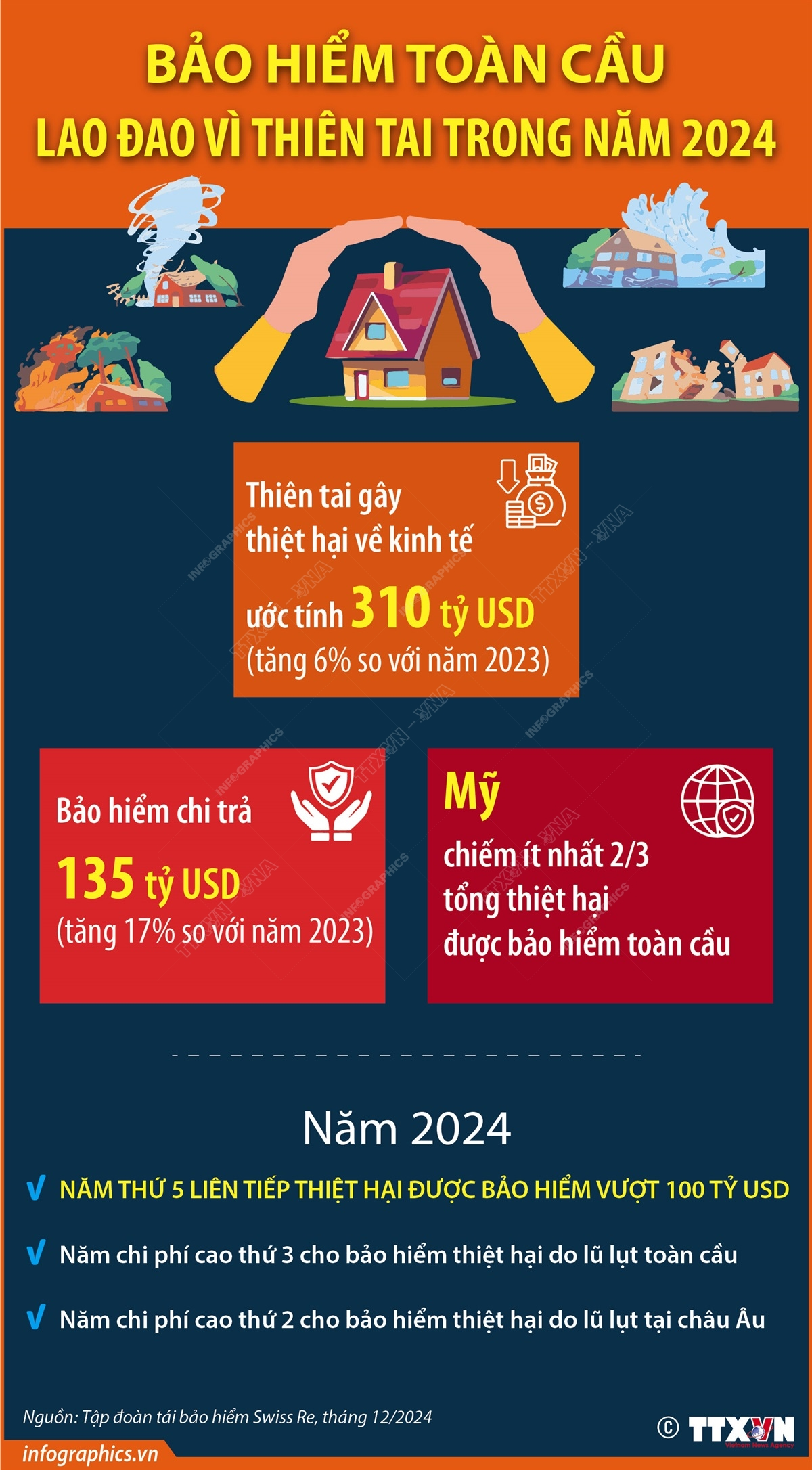 Thiên tai gây thiệt hại kinh tế ước tính 310 tỉ USD trên thế giới trong năm 2024, tăng 6% so với năm 2023 trong bối cảnh cuộc khủng hoảng khí hậu tác động tiêu cực. Đây là đánh giá được Tập đoàn tái bảo hiểm Swiss Re của Thụy Sĩ công bố tháng 12/2024.