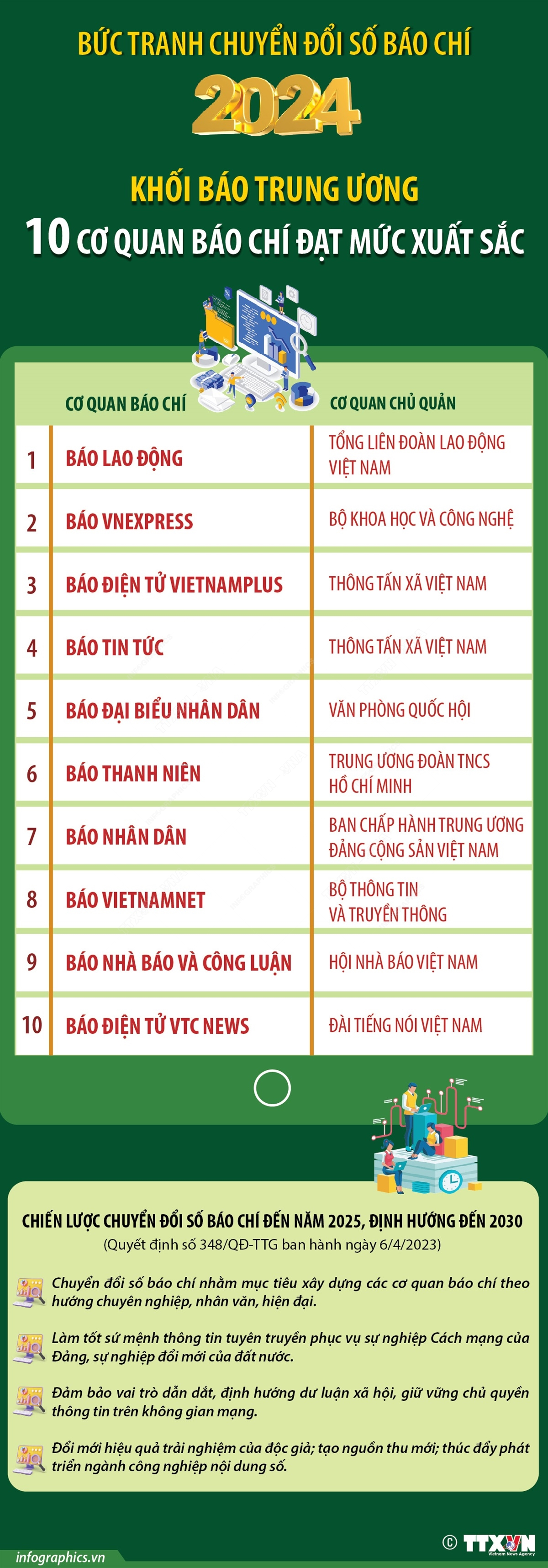 Năm 2024, Bộ Thông tin và Truyền thông tiếp tục công bố xếp hạng về mức độ trưởng thành chuyển đổi số của các cơ quan báo chí theo: Khối Báo Trung ương, Khối Báo địa phương, Khối Tạp chí Trung ương và địa phương, Khối Tạp chí Khoa học và Khối Đài phát thanh, truyền hình. Ở Khối Báo Trung ương, có 10 cơ quan báo chí đạt mức xuất sắc là: Báo Lao động, Báo Vnexpress, Báo Điện tử Vietnamplus, Báo Tin tức, Báo Đại biểu Nhân dân, Báo Thanh niên, Báo Nhân dân, Báo Vietnamnet, Báo Nhà báo và Công luận và Báo Điện tử VTC News.