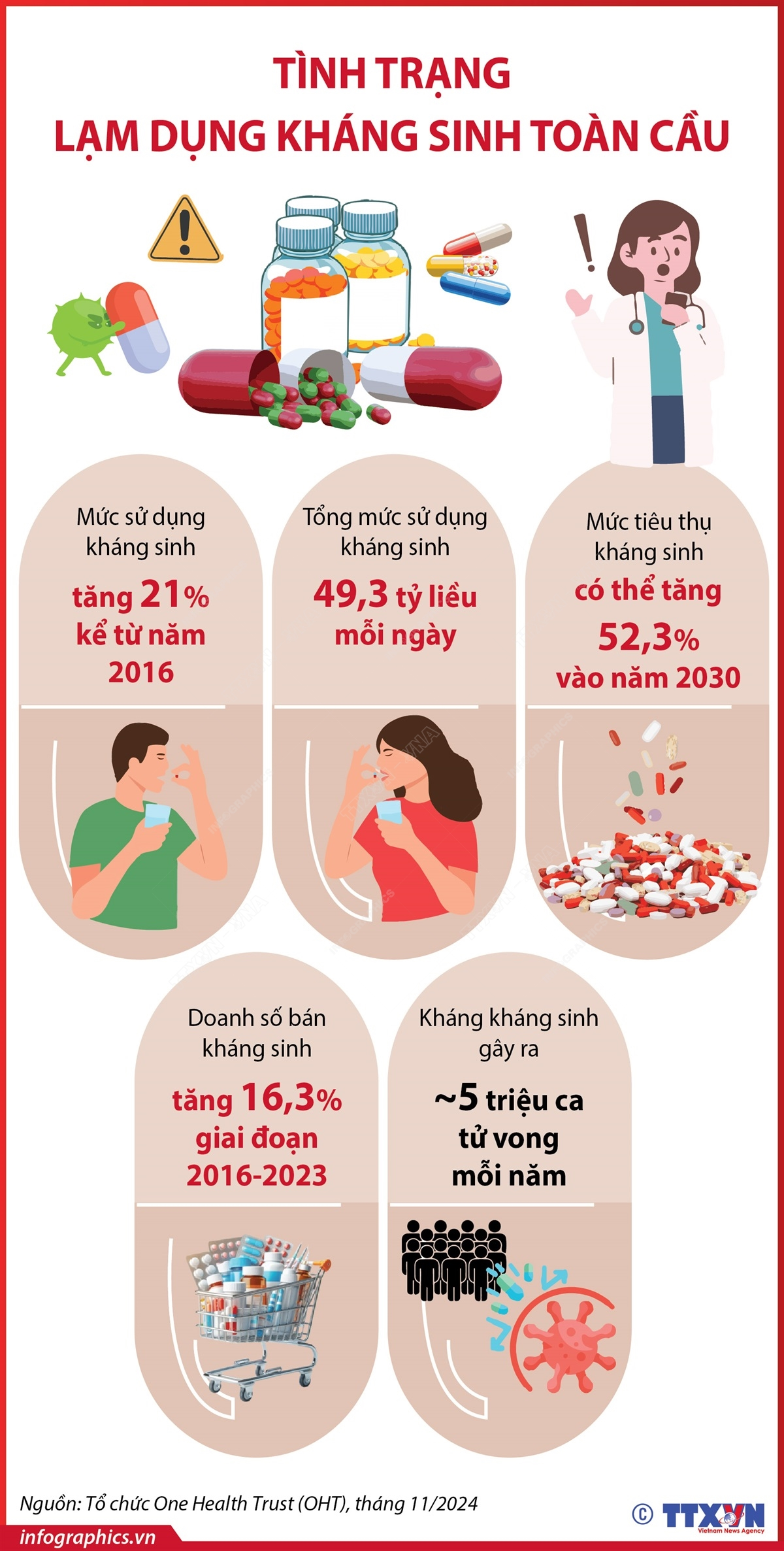 Theo một nghiên cứu được công bố cuối tháng 11/2024, mức sử dụng kháng sinh trên toàn cầu đã tăng 21% kể từ năm 2016, làm dấy lên những lo ngại nghiêm trọng về nguy cơ kháng thuốc kháng sinh. Doanh số bán kháng sinh tại các quốc gia được khảo sát đã tăng từ 29,5 tỷ liều hàng ngày năm 2016 lên 34,3 tỷ liều năm 2023, tương đương mức tăng 16.3%. Ước tính tổng mức sử dụng kháng sinh toàn cầu hiện đạt 49,3 tỷ liều mỗi ngày.