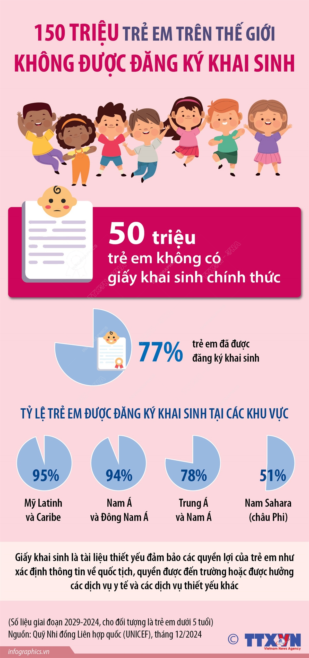 Mặc dù số trẻ em được đăng ký khai sinh đã tăng đáng kể trong những năm gần đây, song vẫn có khoảng 150 triệu trẻ em trên thế giới không được nhận quyền cơ bản này, khiến các em trở thành những đối tượng “vô hình” và dễ bị tổn thương. Đây là cảnh báo được Quỹ Nhi đồng Liên hợp quốc (UNICEF) đưa ra trong báo cáo tháng 12/2024.