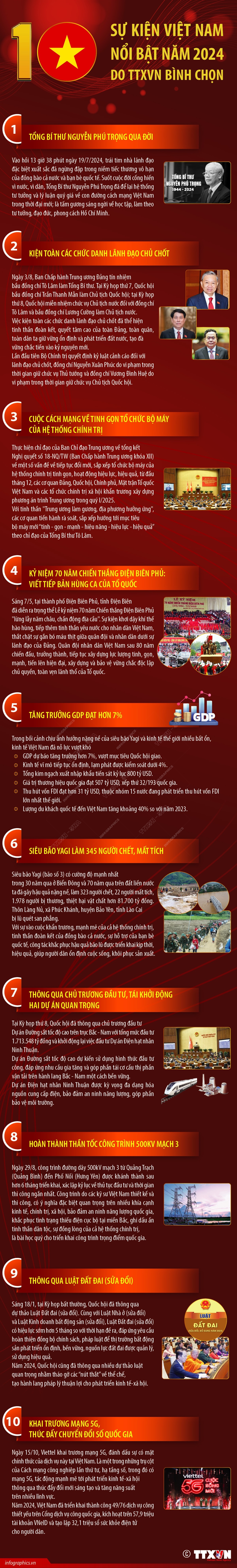 Tổng Bí thư Nguyễn Phú Trọng qua đời; Kiện toàn các chức danh lãnh đạo chủ chốt; Cuộc cách mạng về tinh gọn tổ chức bộ máy của hệ thống chính trị; Kỷ niệm 70 năm Chiến thắng Điện Biên Phủ: Viết tiếp bản hùng ca của Tổ quốc; Tăng trưởng GDP đạt hơn 7%; Siêu bão Yagi làm 345 người chết, mất tích; Thông qua chủ trương đầu tư, tái khởi động hai dự án quan trọng; Hoàn thành thần tốc công trình 500kV mạch 3; Thông qua Luật Đất đai (sửa đổi); Khai trương mạng 5G, thúc đẩy chuyển đổi số quốc gia là 10 sự kiện nổi bật của Việt Nam năm 2024 do TTXVN bình chọn.