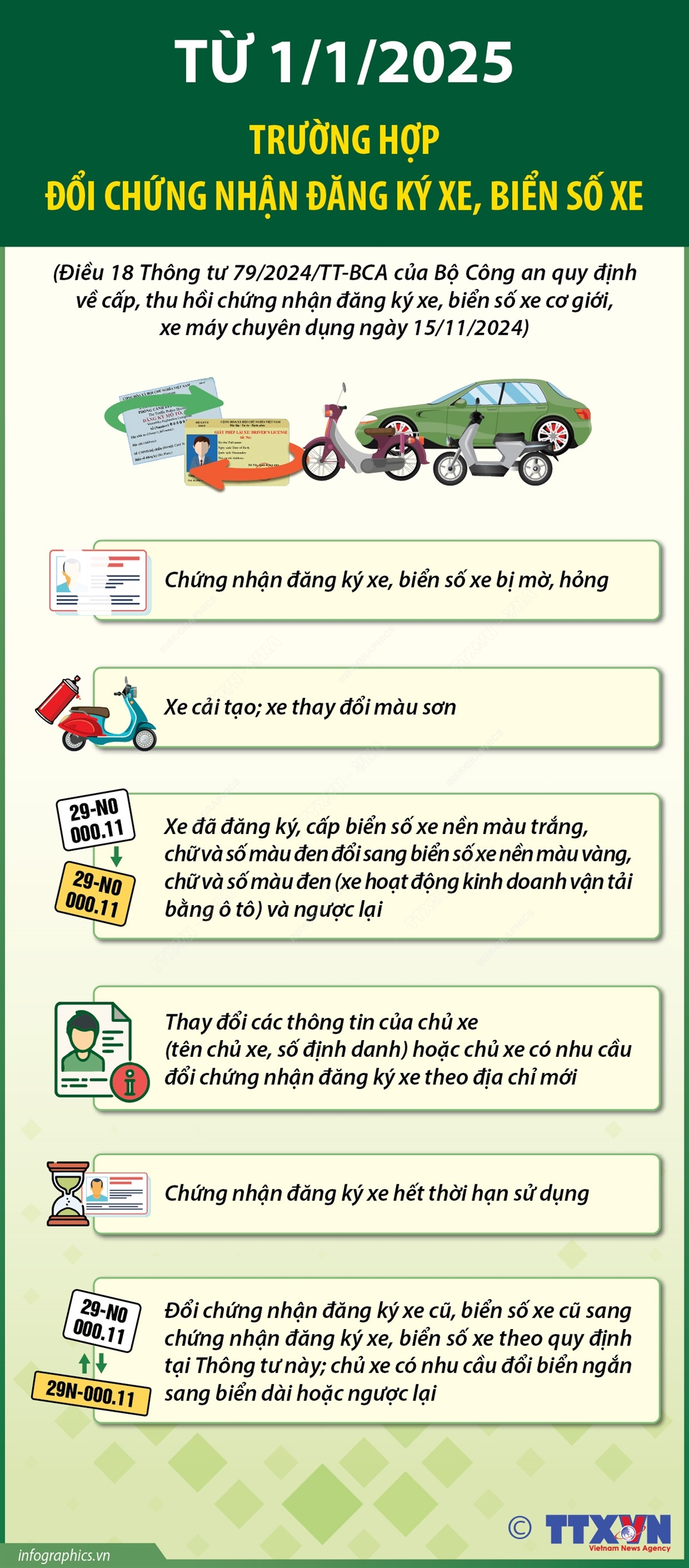 Theo Điều 18 Thông tư 79/2024/TT-BCA của Bộ Công an quy định về cấp, thu hồi chứng nhận đăng ký xe, biển số xe cơ giới, xe máy chuyên dụng, từ 1/1/2025, các trường hợp được đổi chứng nhận đăng ký xe, biển số xe là: Chứng nhận đăng ký xe, biển số xe bị mờ, hỏng; Xe cải tạo; xe thay đổi màu sơn; Xe đã đăng ký, cấp biển số xe nền màu trắng, chữ và số màu đen đổi sang biển số xe nền màu vàng, chữ và số màu đen (xe hoạt động kinh doanh vận tải bằng ô tô) và ngược lại; Thay đổi các thông tin của chủ xe (tên chủ xe, số định danh) hoặc chủ xe có nhu cầu đổi chứng nhận đăng ký xe theo địa chỉ mới; Chứng nhận đăng ký xe hết thời hạn sử dụng và Đổi chứng nhận đăng ký xe cũ, biển số xe cũ sang chứng nhận đăng ký xe, biển số xe theo quy định tại Thông tư này; chủ xe có nhu cầu đổi biển ngắn sang biển dài hoặc ngược lại.