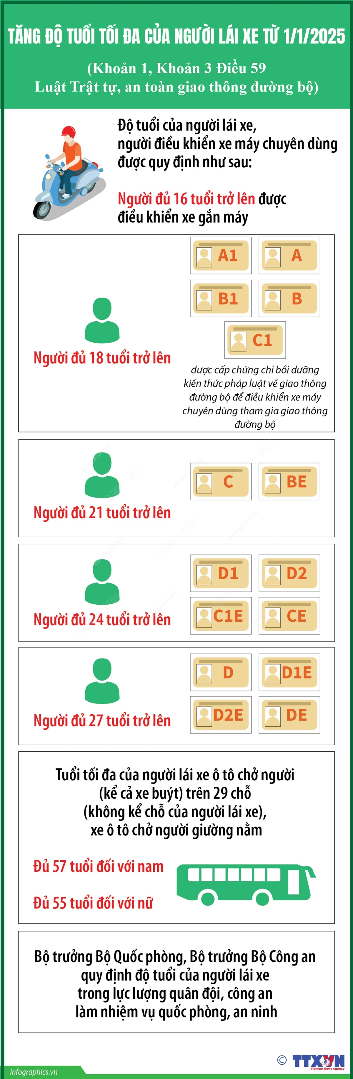 Theo Khoản 1, Khoản 3 Điều 59 Luật Trật tự, an toàn giao thông đường bộ 2024, từ 1/1/2025, người đủ 18 tuổi trở lên được cấp giấy phép lái xe hạng A1, A, B1, B, C1, được cấp chứng chỉ bồi dưỡng kiến thức pháp luật về giao thông đường bộ để điều khiển xe máy chuyên dùng tham gia giao thông đường bộ . Người đủ 21 tuổi trở lên được cấp giấy phép lái xe hạng C, BE; Người đủ 24 tuổi trở lên được cấp giấy phép lái xe hạng D1, D2, C1E, CE; Người đủ 27 tuổi trở lên được cấp giấy phép lái xe hạng D, D1E, D2E, DE. Tuổi tối đa của người lái xe ô tô chở người (kể cả xe buýt) trên 29 chỗ (không kể chỗ của người lái xe), xe ô tô chở người giường nằm là đủ 57 tuổi đối với nam, đủ 55 tuổi đối với nữ.