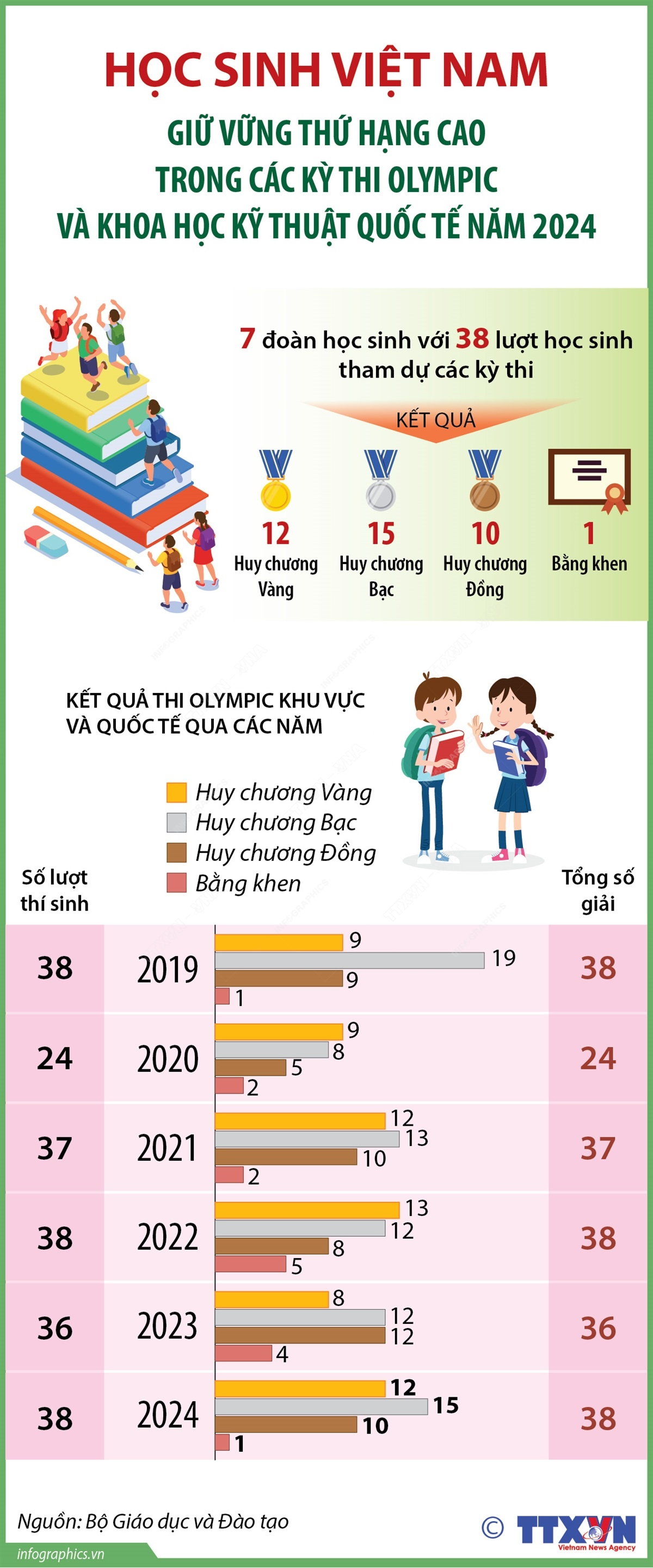 Năm 2024, Việt Nam có 7 đoàn dự thi Olympic quốc tế và khu vực với tổng cộng 38 học sinh tham gia. Thành tích các đoàn dự thi đạt được cao hơn so với các năm trước với 12 Huy chương Vàng, 15 Huy chương Bạc, 10 Huy chương Đồng và 1 Bằng khen, khẳng định sự vươn lên mạnh mẽ về chất lượng giáo dục mũi nhọn của Việt Nam.