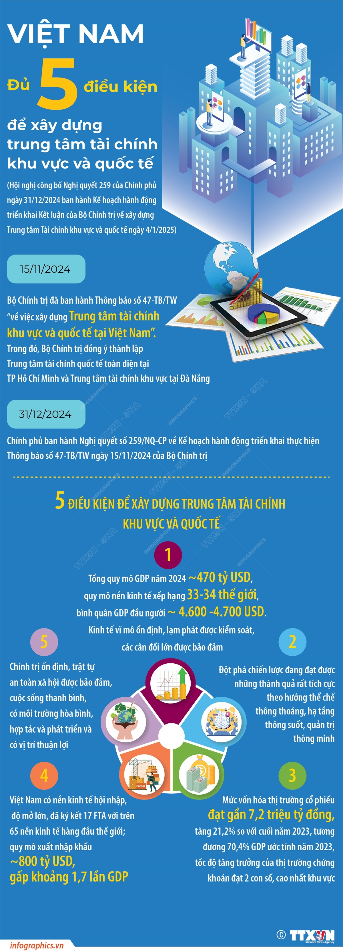 Tại TP Hồ Chí Minh, Thủ tướng Phạm Minh Chính chủ trì Hội nghị công bố Nghị quyết 259 của Chính phủ ngày 31/12/2024 ban hành Kế hoạch hành động triển khai Kết luận của Bộ Chính trị về xây dựng Trung tâm Tài chính khu vực và quốc tế tại TP Hồ Chí Minh. Phát biểu tại Hội nghị, Thủ tướng khẳng định, Việt Nam đang có đủ 5 yếu tố, điều kiện cần thiết để phát triển thị trường tài chính hiện đại, hướng đến hình thành trung tâm tài chính quốc tế và khu vực. Thủ tướng đánh giá, việc sớm phát triển trung tâm tài chính và khu vực và quốc tế có 5 ý nghĩa, tác động tích cực: Giúp Việt Nam kết nối thị trường tài chính toàn cầu; thu hút các tổ chức tài chính nước ngoài, tạo thêm nguồn lực mới, thúc đẩy nguồn lực hiện hữu; tận dụng cơ hội dịch chuyển dòng vốn đầu tư quốc tế để phát triển kinh tế-xã hội; thúc đẩy phát triển thị trường tài chính Việt Nam hiệu quả, theo chuẩn mực quốc tế; tạo ra động lực mới, tạo sự đột phá về phát triển.