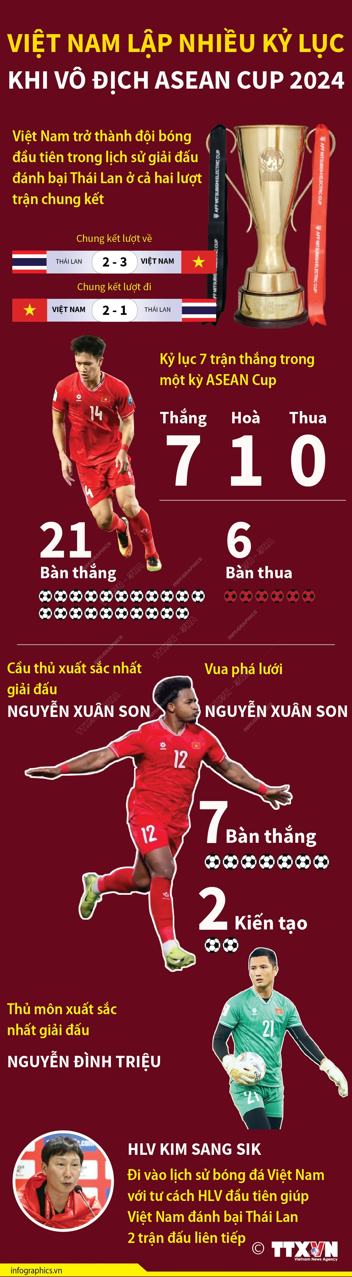 Việt Nam là đội bóng đầu tiên thắng Thái Lan cả hai lượt trận chung kết bóng đá Đông Nam Á, để lần thứ ba đăng quang ASEAN Cup. Việt Nam cũng lập kỷ lục thắng ở ASEAN Cup, với 7 trận. Sau 29 năm lịch sử giải, chưa đội nào làm được điều này trong một kỳ thi đấu, ngay cả Thái Lan. Việt Nam kết thúc giải với 7 thắng, một hòa và không thua.