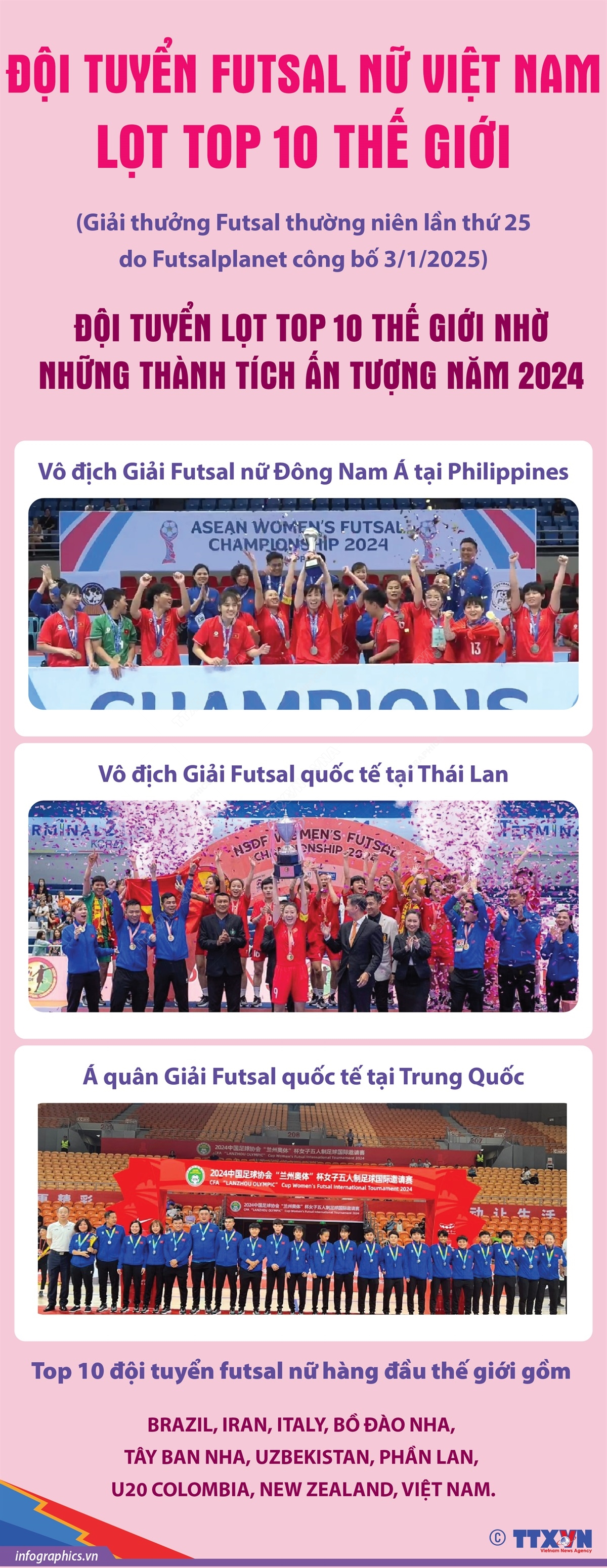 Với thành tích ấn tượng trong năm 2024, đội tuyển futsal nữ Việt Nam lọt vào Top 10 thế giới tại Giải thưởng Futsal thường niên lần thứ 25 do Futsalplanet công bố ngày 3/1/2025, sánh vai cùng các đội tuyển hàng đầu thế giới như Brazil, Iran, Italia, Bồ Đào Nha, Tây Ban Nha, Uzbekistan, Phần Lan, U20 Colombia và New Zealand. Đây là lần đầu tiên một đội tuyển futsal Việt Nam đạt được thành tích này tại Giải thưởng do trang Futsalplanet tổ chức hằng năm, một trong những đơn vị uy tín nhất thế giới trong môn futsal.