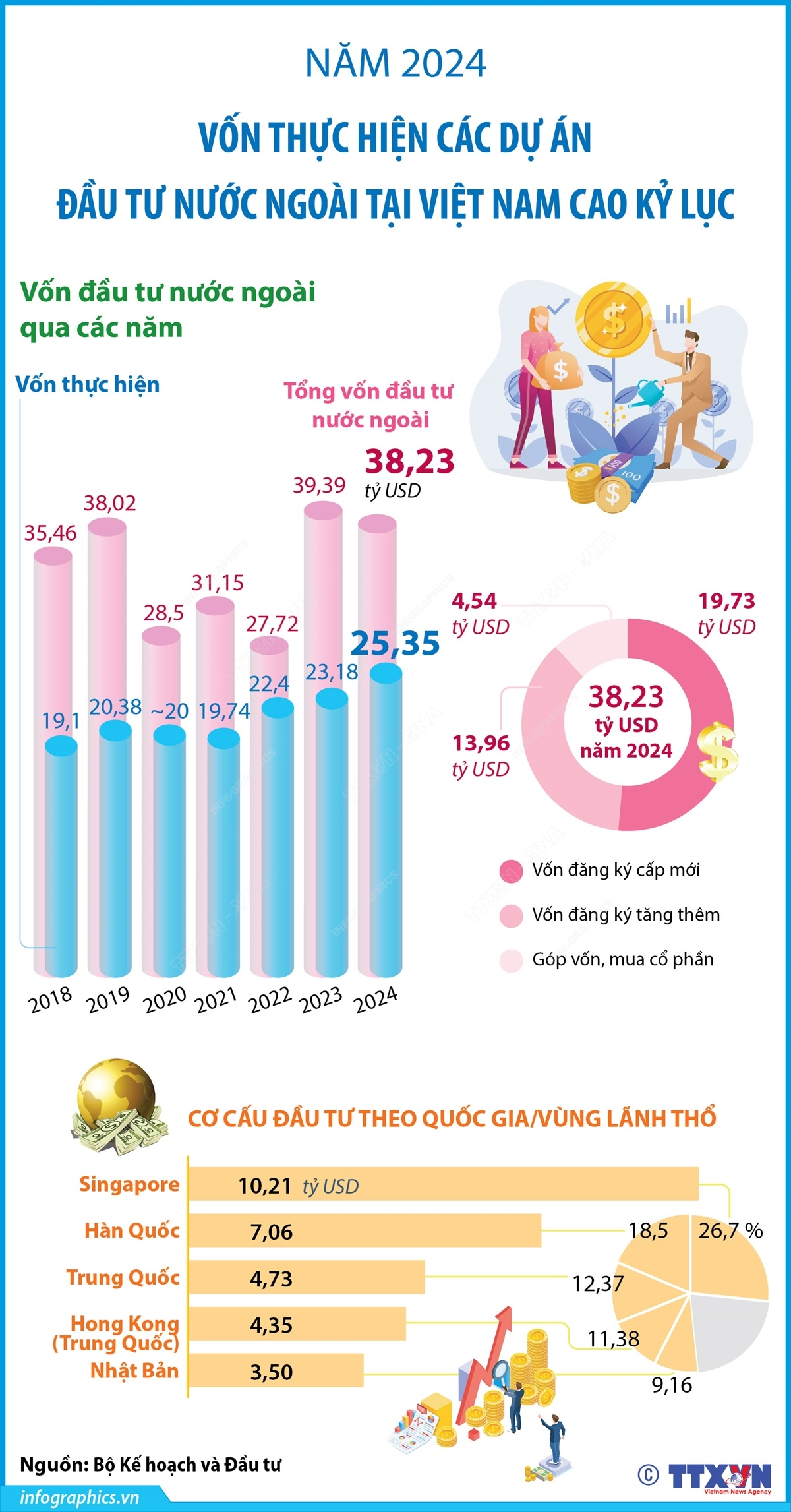 Tính đến hết năm 2024, vốn thực hiện của dự án đầu tư nước ngoài tại Việt Nam ước đạt khoảng 25,35 tỷ USD, tăng 9,4% so với năm 2023, đánh dấu mức giải ngân cao nhất từ trước đến nay. Tổng vốn đăng ký cấp mới, điều chỉnh và góp vốn mua cổ phần, mua phần vốn góp của nhà đầu tư nước ngoài đạt gần 38,23 tỷ USD.