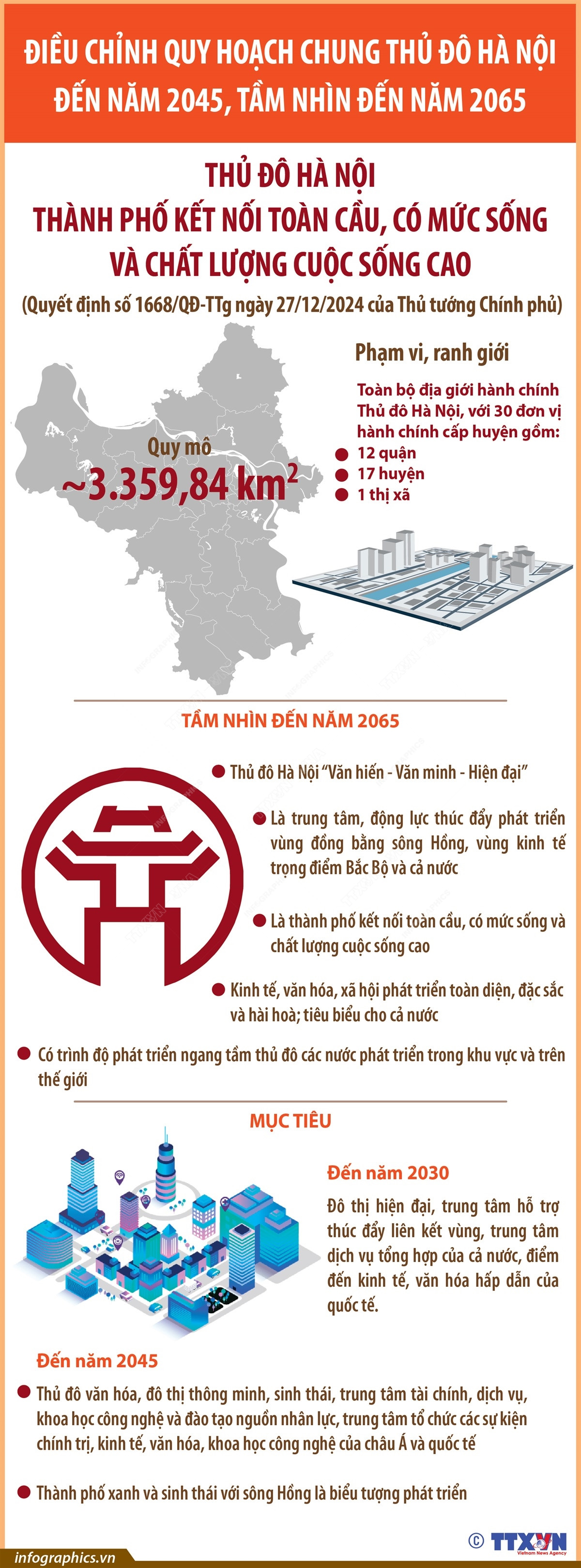 Theo Quyết định số 1668/QĐ-TTg ngày 27/12/2024 của Thủ tướng Chính phủ phê duyệt Điều chỉnh Quy hoạch chung Thủ đô Hà Nội đến năm 2045, tầm nhìn đến năm 2065, phạm vi, ranh giới lập quy hoạch là toàn bộ địa giới hành chính Thủ đô Hà Nội, với 30 đơn vị hành chính cấp huyện, gồm 12 quận, 17 huyện và 1 thị xã. Quy mô lập quy hoạch khoảng 3.359,84 km2. Thời hạn quy hoạch trong giai đoạn ngắn hạn đến năm 2030; giai đoạn dài hạn đến năm 2045 và tầm nhìn đến năm 2065.