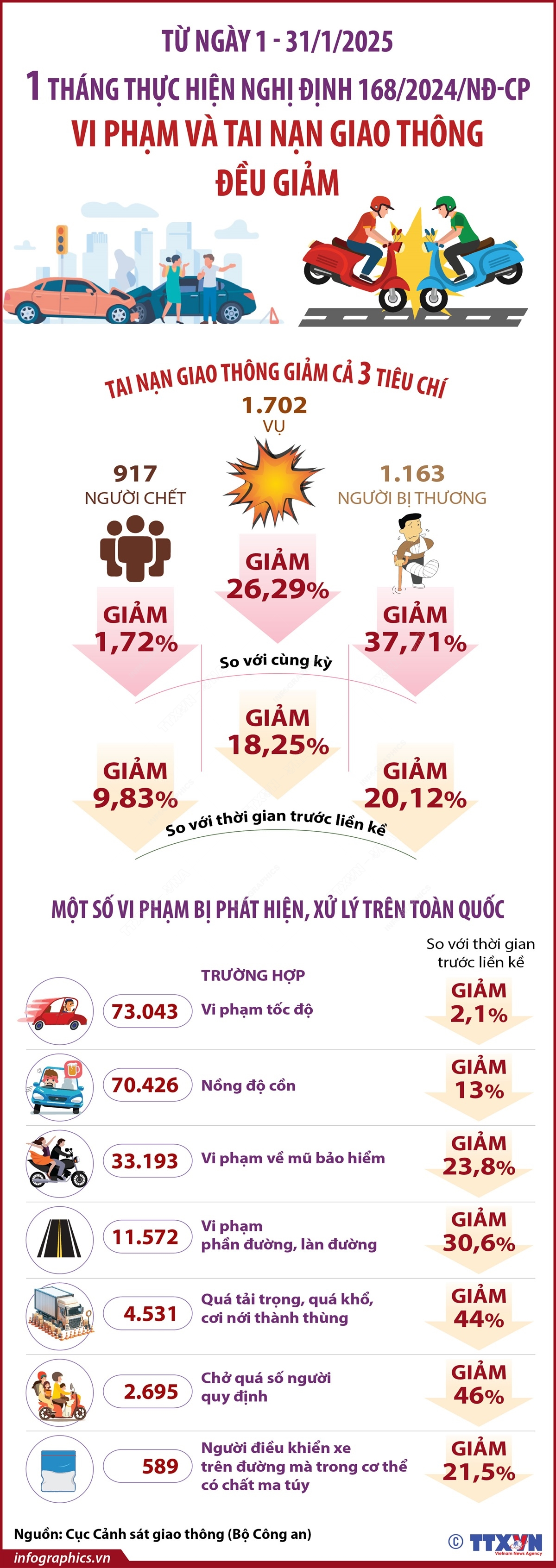 Từ ngày 1 đến 31/1/2025 - Một tháng thực hiện Nghị định 168/2024/NĐ-CP: Vi phạm và tai nạn giao thông đều giảm