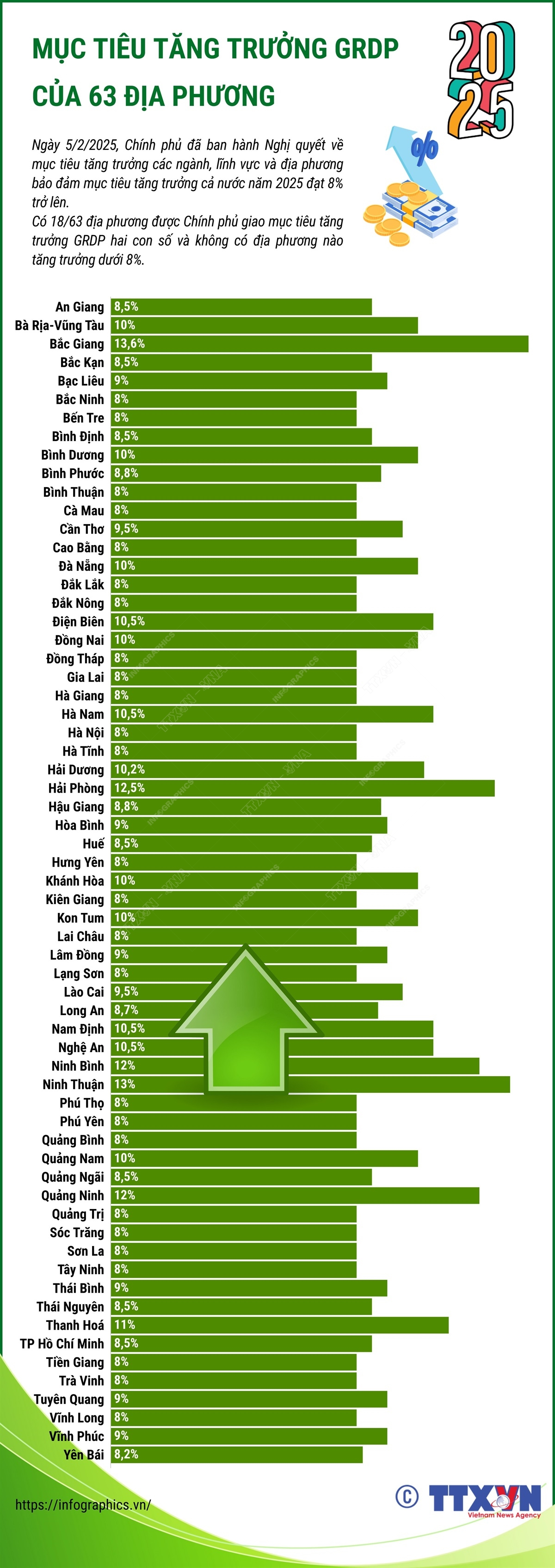 Chính phủ đã ban hành Nghị quyết về mục tiêu tăng trưởng các ngành, lĩnh vực và địa phương nhằm bảo đảm mục tiêu tăng trưởng cả nước năm 2025 đạt 8% trở lên. Có 18/63 địa phương được Chính phủ giao mục tiêu tăng trưởng GRDP hai con số và không có địa phương nào tăng trưởng dưới 8%.
