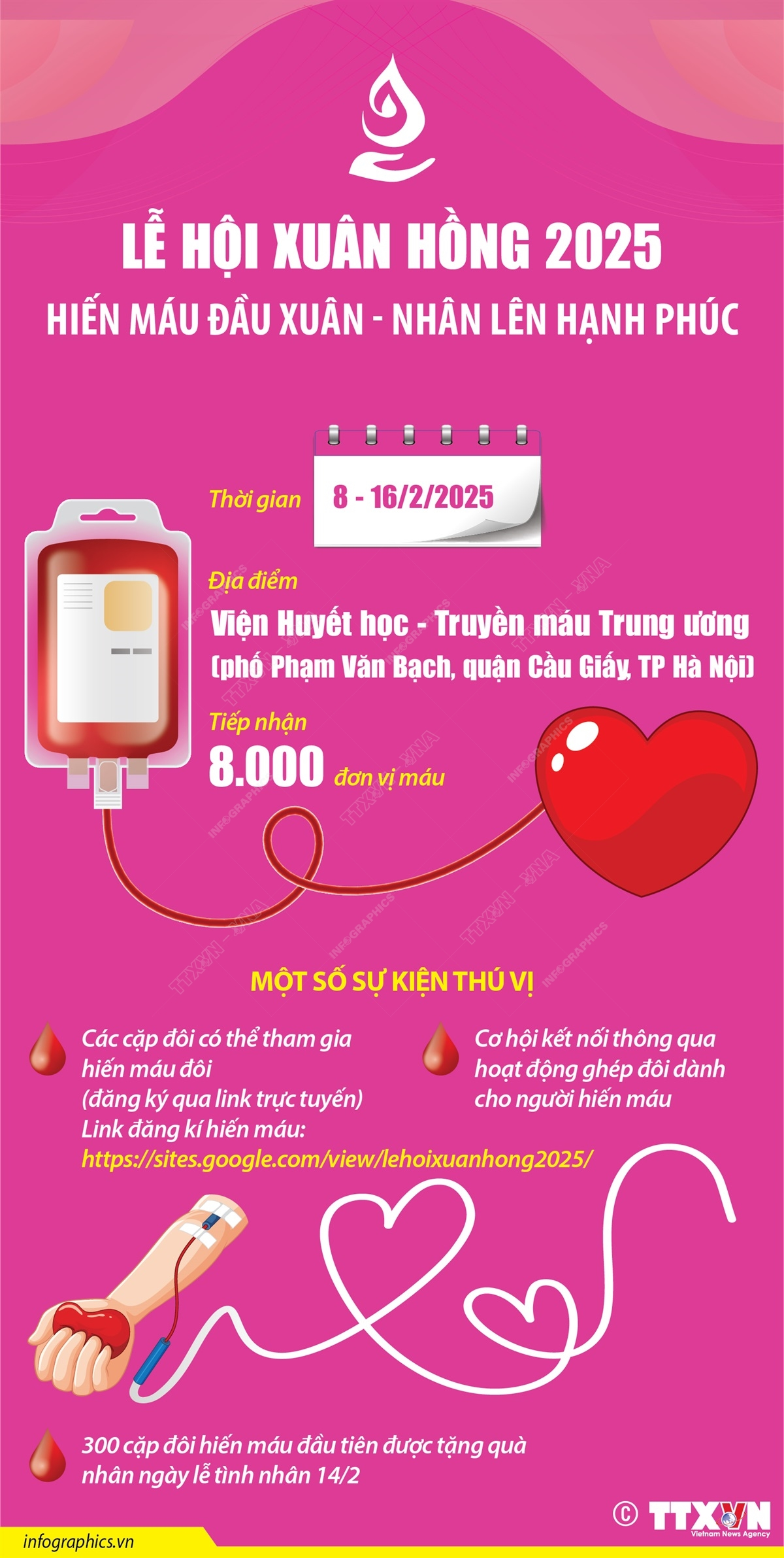 Lễ hội Xuân hồng lần thứ 18 diễn ra trong 9 ngày, từ 8 - 16/2/2025, tại Viện Huyết học - Truyền máu Trung ương (phố Phạm Văn Bạch, quận Cầu Giấy, TP Hà Nội). Chương trình nhằm mục tiêu tiếp nhận 8.000 đơn vị máu, góp phần bổ sung nguồn máu dự trữ phục vụ công tác điều trị và cấp cứu tại Hà Nội cũng như nhiều tỉnh, thành trên cả nước. Hiến máu đầu Xuân không chỉ là một nghĩa cử cao đẹp mà còn trở thành một nét văn hóa cộng đồng, gói trọn tinh thần tương thân tương ái và những giá trị truyền thống tốt đẹp của dân tộc. Bên cạnh đó, thời điểm sau Tết Nguyên đán là giai đoạn nhu cầu máu cho cấp cứu và điều trị tăng cao do lượng bệnh nhân quay trở lại bệnh viện sau kỳ nghỉ kéo dài. Việc tham gia hiến máu đầu năm không chỉ giúp đảm bảo nguồn cung máu mà còn mang lại may mắn, sức khỏe cho chính người hiến máu trong năm mới.