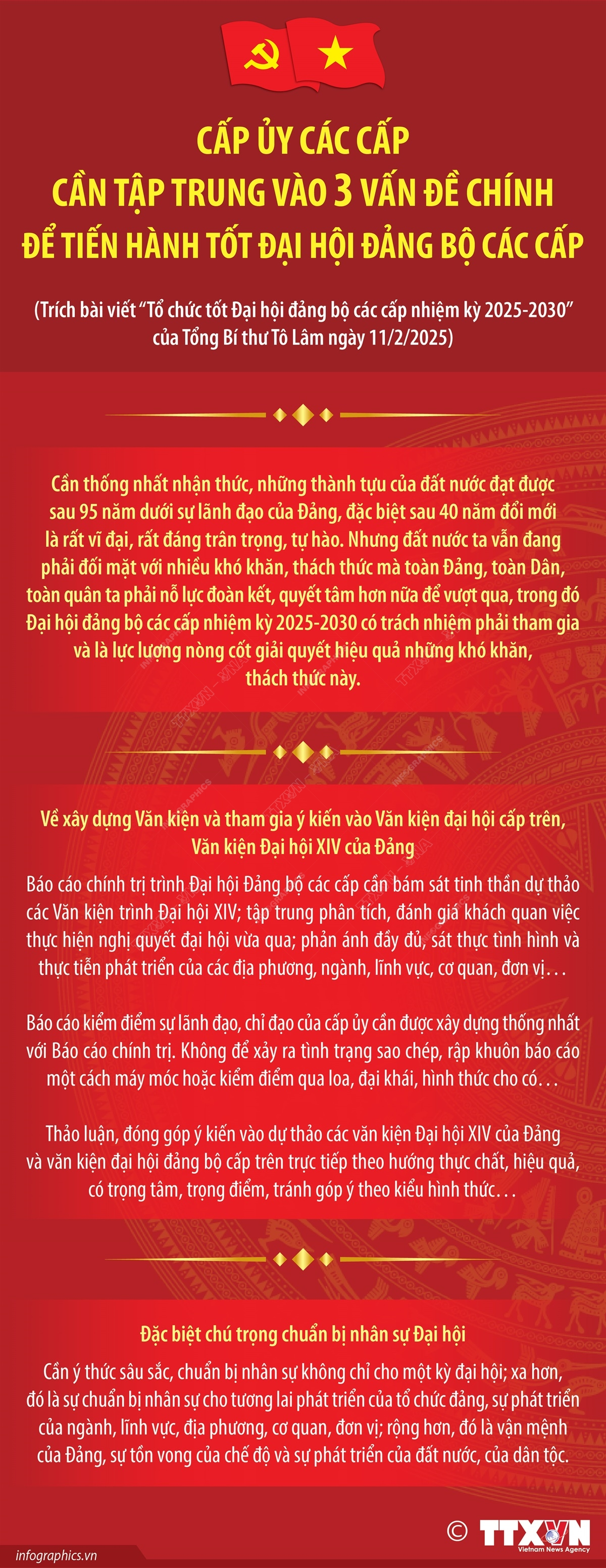 Trong bài viết “Tổ chức tốt Đại hội đảng bộ các cấp nhiệm kỳ 2025-2030” ngày 11/2/2025, Tổng Bí thư Tô Lâm chỉ rõ các cấp ủy cần tập trung vào 3 vấn đề chính để tiến hành tốt Đại hội Đảng bộ các cấp. Thứ nhất, cần thống nhất nhận thức, những thành tựu của đất nước đạt được sau 95 năm dưới sự lãnh đạo của Đảng, đặc biệt sau 40 năm đổi mới là rất vĩ đại, rất đáng trân trọng, tự hào. Nhưng đất nước ta vẫn đang phải đối mặt với nhiều khó khăn, thách thức mà toàn Đảng, toàn Dân, toàn quân ta phải nỗ lực đoàn kết, quyết tâm hơn nữa để vượt qua, trong đó Đại hội đảng bộ các cấp nhiệm kỳ 2025-2030 có trách nhiệm phải tham gia và là lực lượng nòng cốt giải quyết hiệu quả những khó khăn, thách thức này. Thứ hai, về xây dựng Văn kiện và tham gia ý kiến vào Văn kiện đại hội cấp trên, Văn kiện Đại hội XIV của Đảng. Thứ Ba, đặc biệt chú trọng chuẩn bị nhân sự Đại hội.