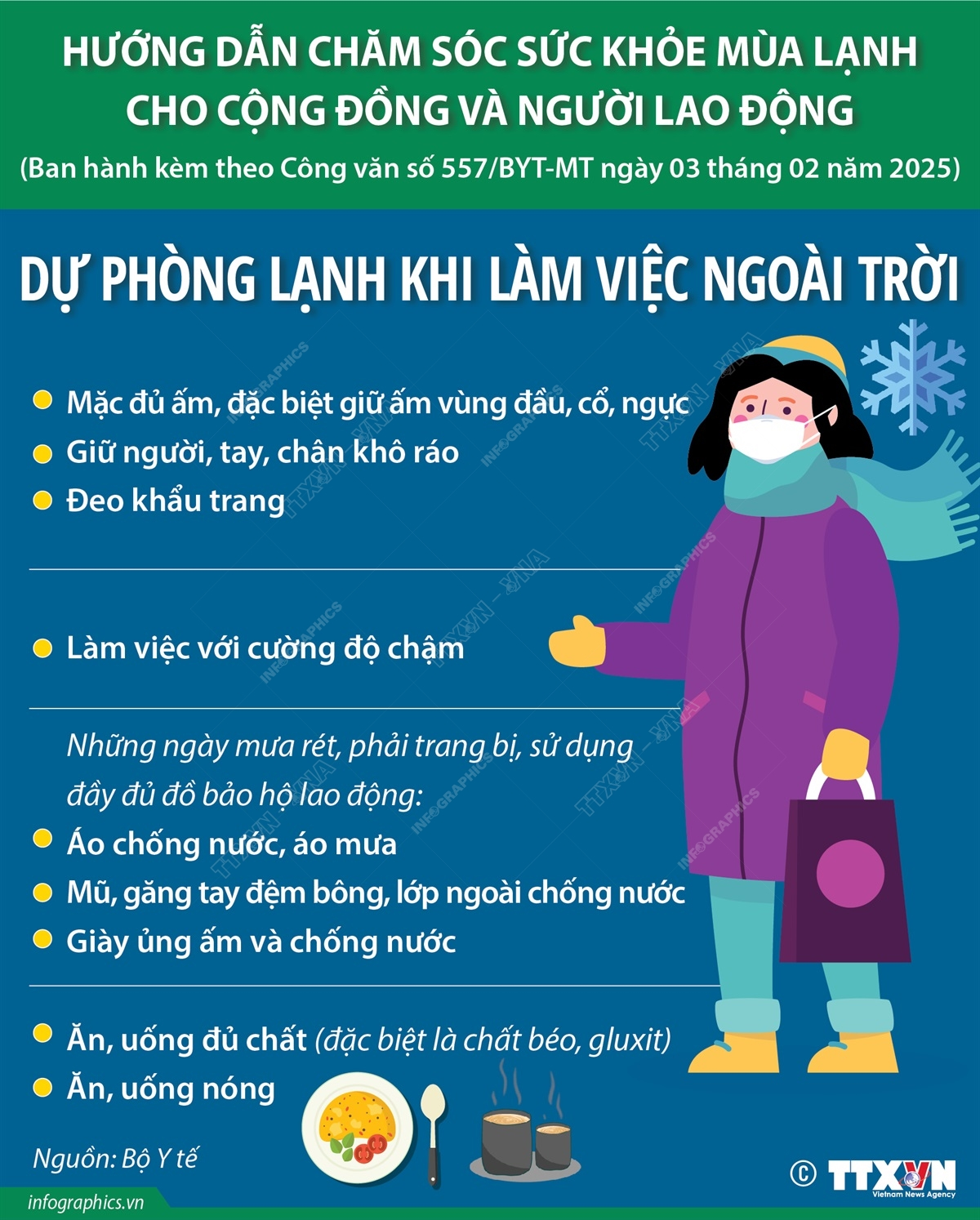 Miền Bắc đang trải qua đợt rét đậm, rét hại trên diện rộng. Thời tiết lạnh gây ảnh hưởng lớn đến sức khỏe, người dân có thể bị cảm lạnh, hen suyễn, viêm họng, viêm phổi… Vì vậy, nếu bạn phải làm việc ngoài trời mưa lạnh cần giữ ấm cơ thể; làm việc với cường độ chậm; phải trang bị và sử dụng đầy đủ đồ bảo hộ lao động áp chống nước, áo mưa, mũ, găng tay đệm bông và lớp ngoài chống nước; giày ủng ấm và chống nước….để bảo vệ sức khỏe của bản thân.