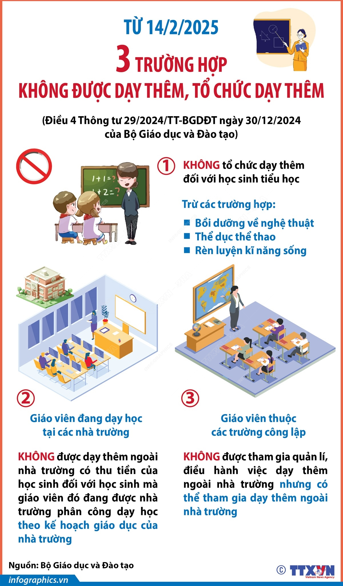 Theo Điều 4 Thông tư 29/2024/TT-BGDĐT của Bộ Giáo dục và Đào tạo quy định về dạy thêm, học thêm, từ 14/2/2025, có 3 trường hợp không được dạy thêm, tổ chức dạy thêm: Không tổ chức dạy thêm đối với học sinh tiểu học, trừ các trường hợp: bồi dưỡng về nghệ thuật, thể dục thể thao, rèn luyện kĩ năng sống; Giáo viên đang dạy học tại các nhà trường không được dạy thêm ngoài nhà trường có thu tiền của học sinh đối với học sinh mà giáo viên đó đang được nhà trường phân công dạy học theo kế hoạch giáo dục của nhà trường và Giáo viên thuộc các trường công lập không được tham gia quản lí, điều hành việc dạy thêm ngoài nhà trường nhưng có thể tham gia dạy thêm ngoài nhà trường.