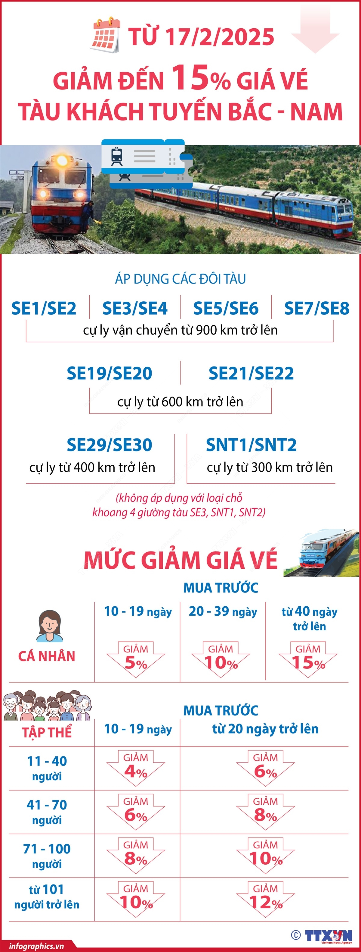 Từ ngày 17/2/2025, ngành đường sắt chính thức áp dụng các chính sách khuyến mãi, giảm giá vé dịp thấp điểm sau Tết cho tàu khách tuyến Bắc - Nam. Theo đó, hành khách mua vé cá nhân xa ngày các đôi tàu SE1/SE2, SE3/SE4, SE5/SE6, SE7/SE8 có cự ly vận chuyển từ 900 km trở lên; 2 đôi tàu SE19/SE20, SE21/SE22 có cự ly từ 600 km trở lên; đôi tàu SE29/SE30 có cự ly từ 400 km trở lên; đôi tàu SNT1/SNT2 có cự ly từ 300 km trở lên (không áp dụng với loại chỗ khoang 4 giường tàu SE3 và đôi tàu SNT1/SNT2) sẽ được giảm theo thời gian mua vé trước ngày đi tàu…