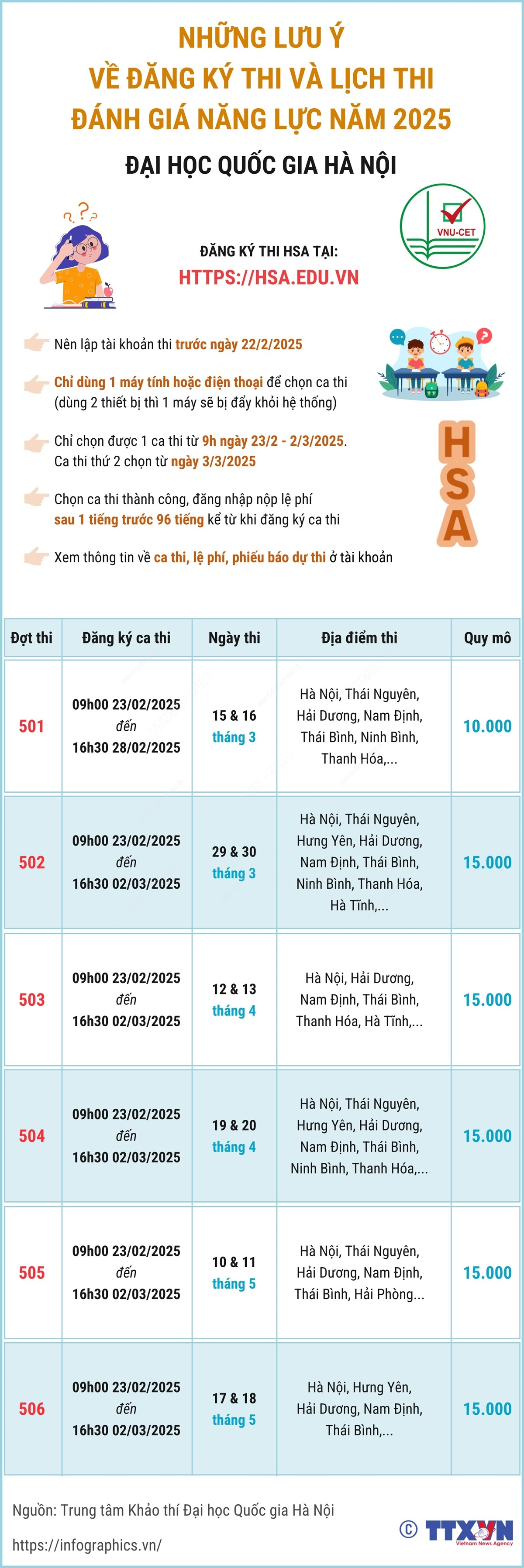 Kỳ thi đánh giá năng lực năm 2025 của Đại học Quốc gia Hà Nội sẽ được tổ chức làm 6 đợt, trong đó đợt thi sớm nhất diễn ra vào hai ngày 15 và 16/3, đợt muộn nhất diễn ra vào hai ngày 17 và 18/5. Thí sinh đăng ký thi tại https://hsa.edu.vn và nên lập tài khoản thi trước ngày 22/2/2025.