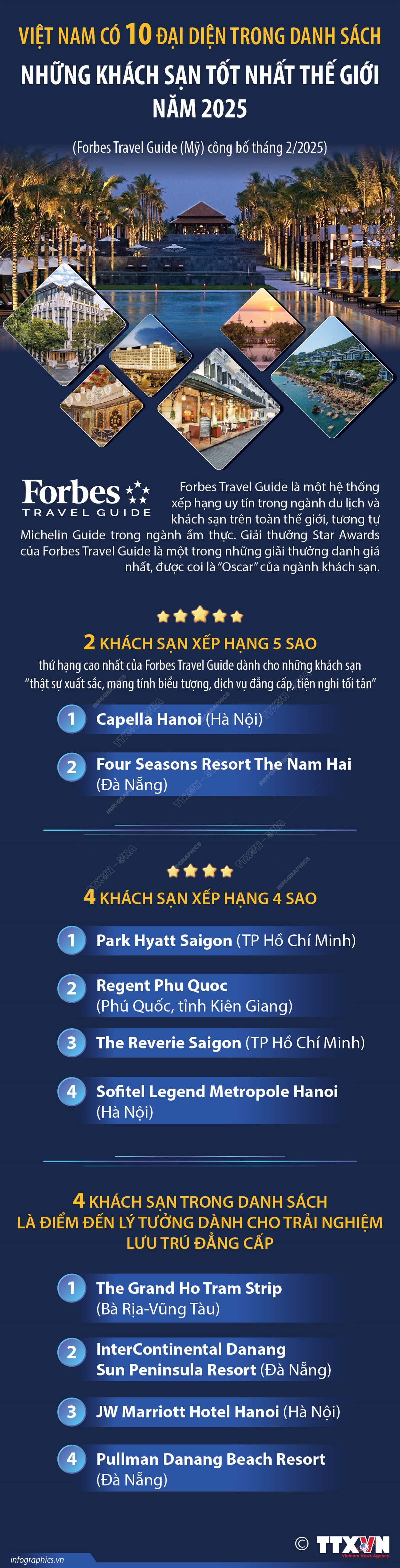 Capella Hanoi (Hà Nội) và Four Seasons Resort The Nam Hai (Đà Nẵng) là 2 đại diện của Việt Nam lọt top khách sạn 5 sao tốt nhất thế giới 2025 do Forbes Travel Guide (Mỹ) bình chọn. Danh sách những khách sạn tốt nhất thế giới 2025 được Forbes Travel Guide công bố tại Lễ trao giải Star Awards diễn ra vào tháng 2/2025. Việt Nam có 10 đại diện trong bảng xếp hạng với 2 khách sạn đạt chuẩn 5 sao, 4 khách sạn xếp hạng 4 sao và 4 khách sạn trong danh sách là điểm đến lý tưởng dành cho trải nghiệm lưu trú đẳng cấp. Forbes Travel Guide là một hệ thống xếp hạng uy tín trong ngành du lịch và khách sạn trên toàn thế giới, tương tự Michelin Guide trong ngành ẩm thực. Thứ hạng cao nhất (5 sao) của Forbes Travel Guide dành cho những khách sạn “thật sự xuất sắc, mang tính biểu tượng, dịch vụ đẳng cấp, tiện nghi tối tân”.