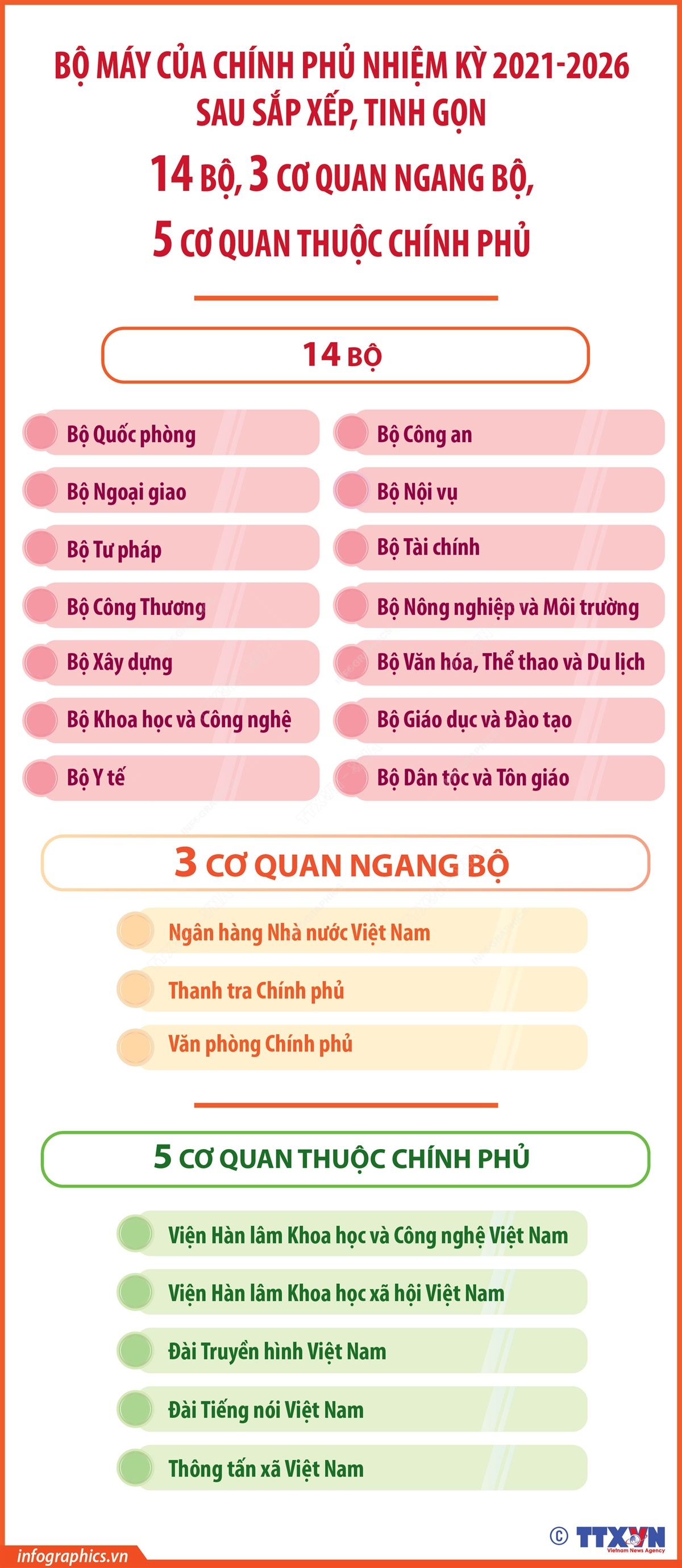 Sau sắp xếp, tinh gọn, Chính phủ nhiệm kỳ 2021-2026 có 14 Bộ, 3 Cơ quan ngang Bộ và 5 cơ quan thuộc Chính phủ.